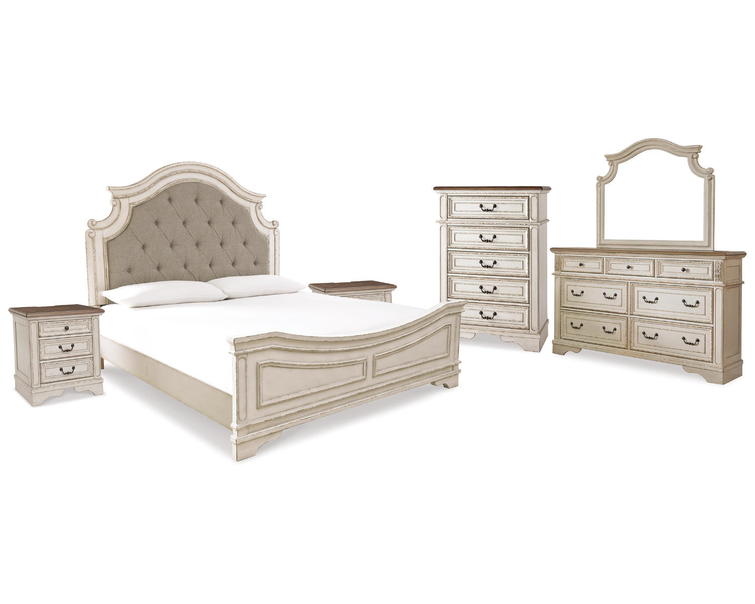 The Realyn king-size bedroom set offers a refined, two-tone look with an inviting upholstered panel bed. This complete collection includes a king bed, dresser with a coordinating mirror, a chest, and two nightstands—delivering a cohesive, stylish solution for master suites and guest rooms alike.