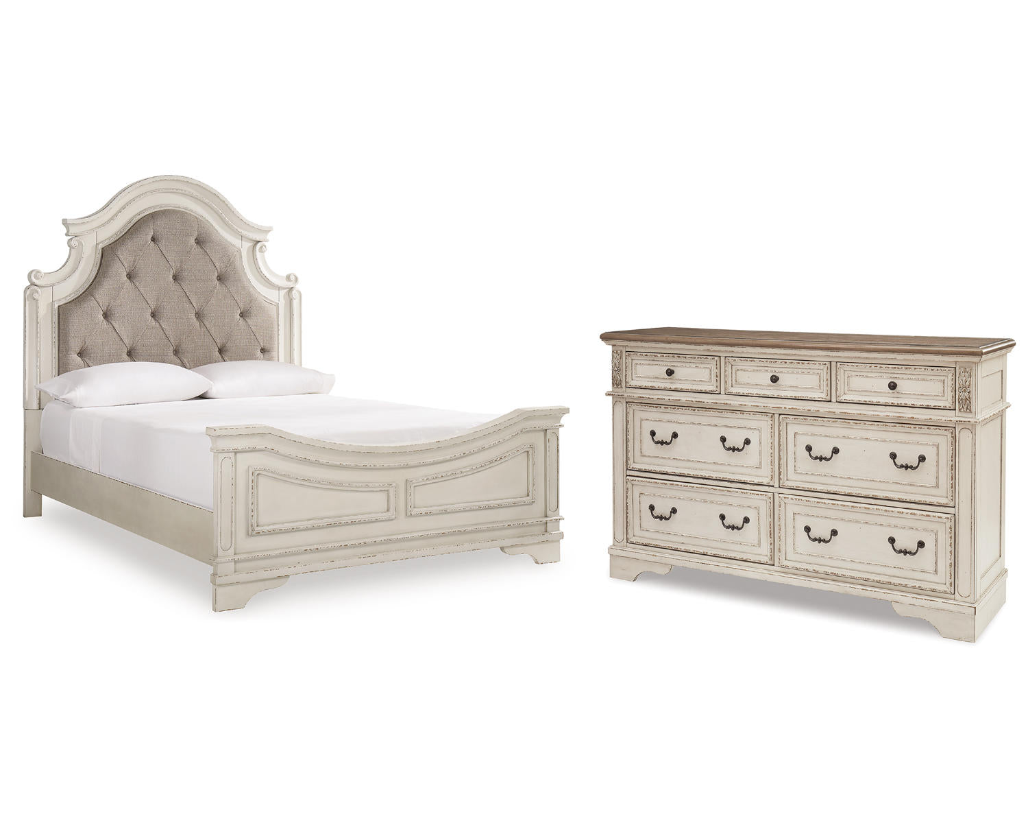 Discover timeless elegance with the Realyn Queen Panel Bed and Dresser, a two-piece bedroom set crafted for both style and everyday practicality. This two-tone ensemble is ideal for guest rooms, master bedrooms, or any space that values clean lines and versatile color. It pairs a classic panel bed with a coordinating dresser to create a cohesive, easy-to-update look.