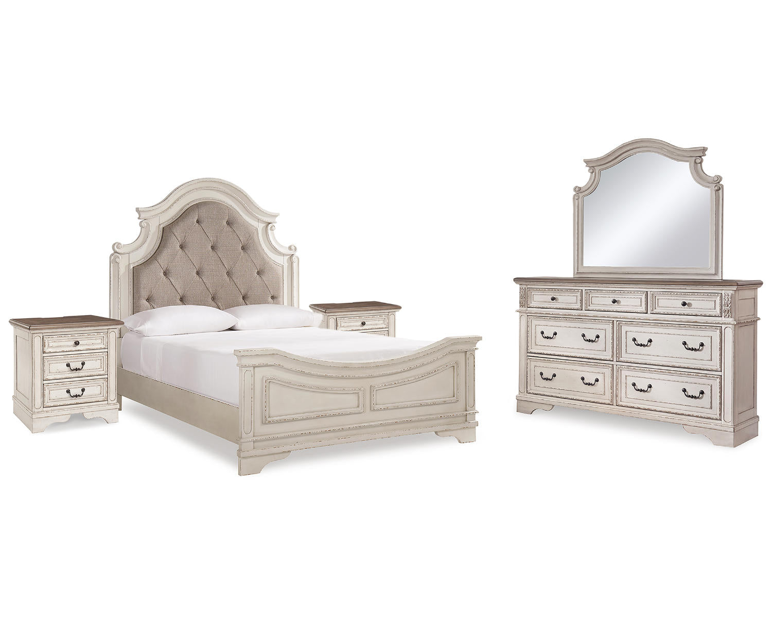 Realyn Queen Upholstered Panel Bed, Dresser, Mirror & 2 Nightstands — Two-Tone