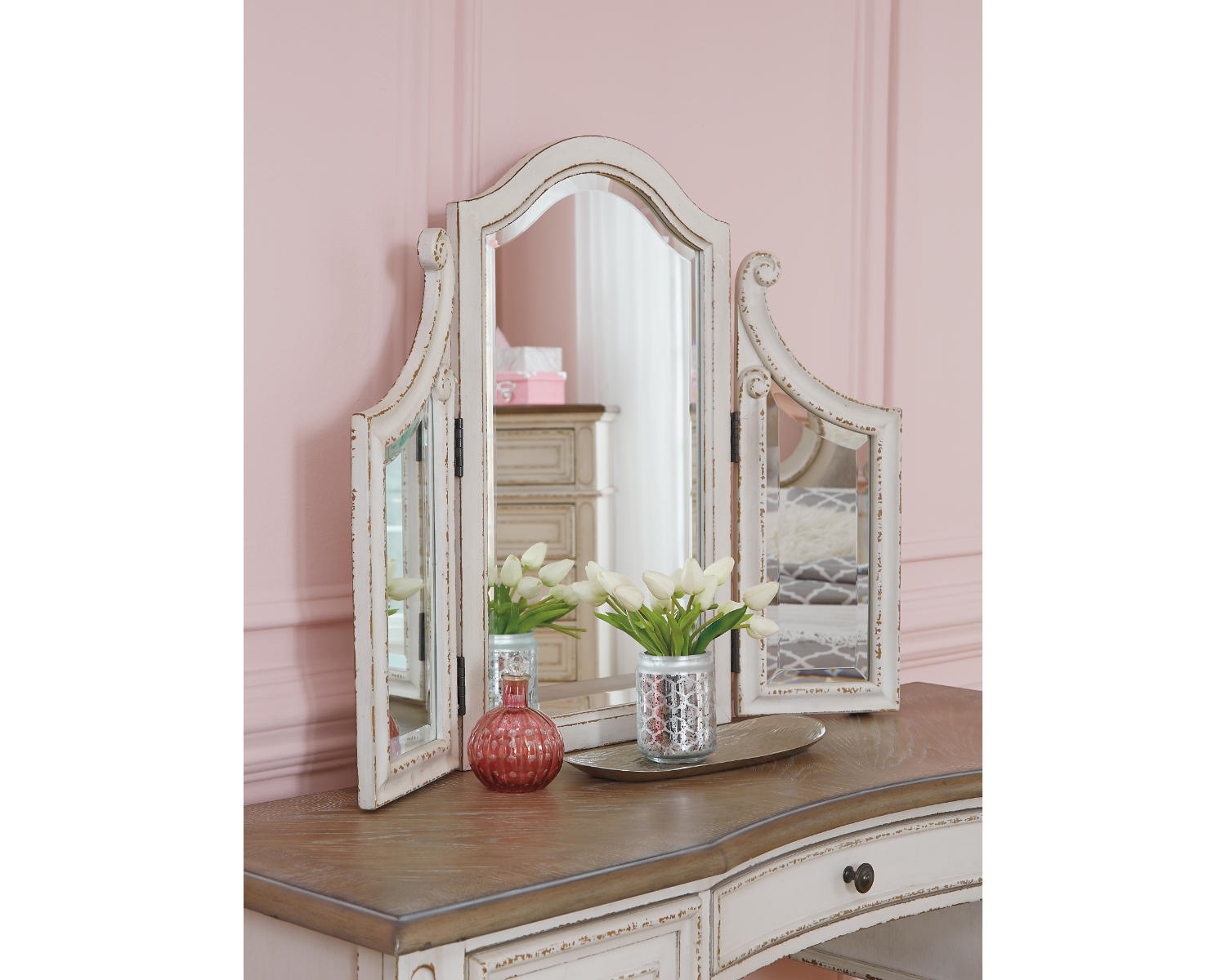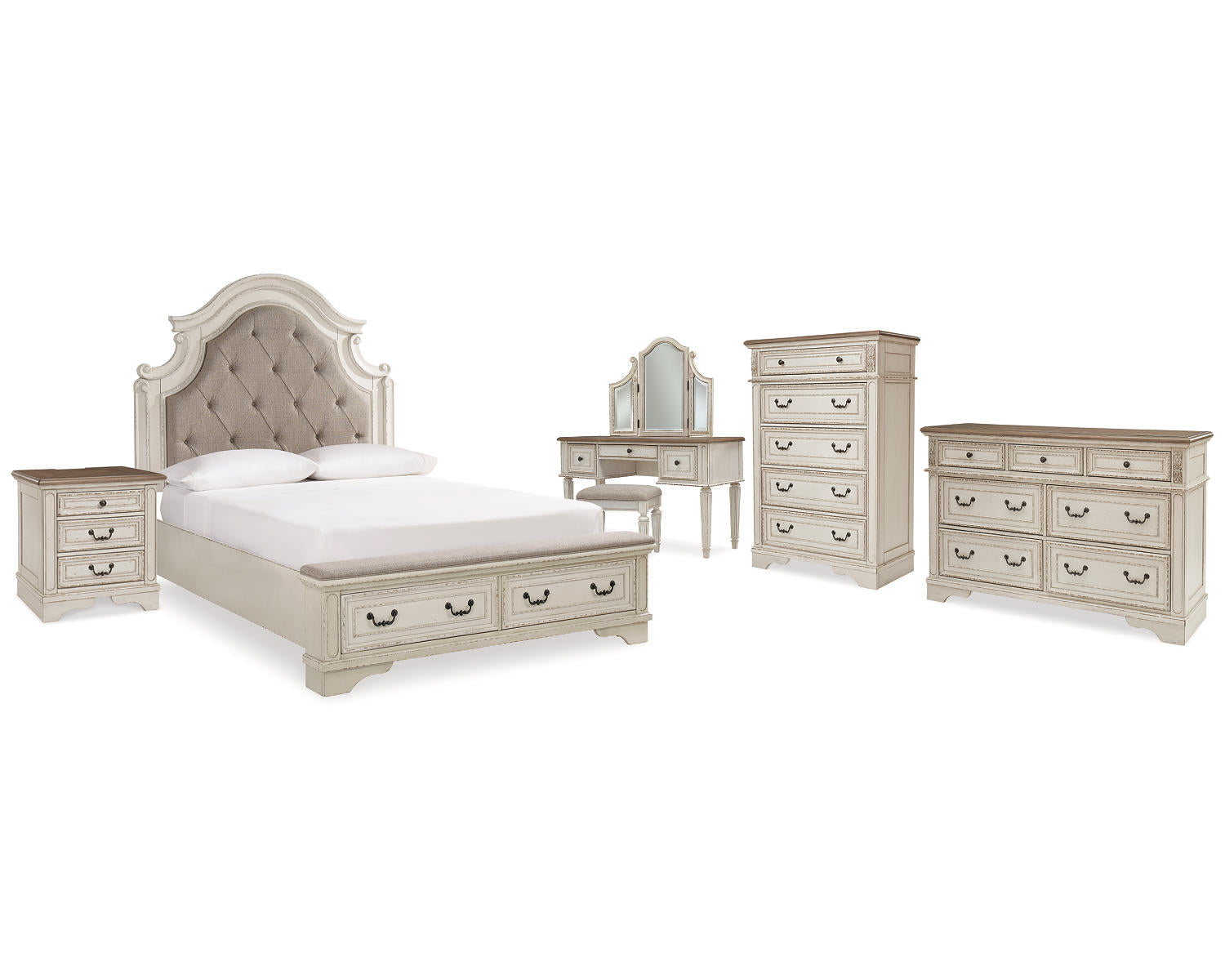 Realyn Queen Upholstery Panel Bed, Dresser, Chest, Nightstand, and Vanity Set — Two-Tone