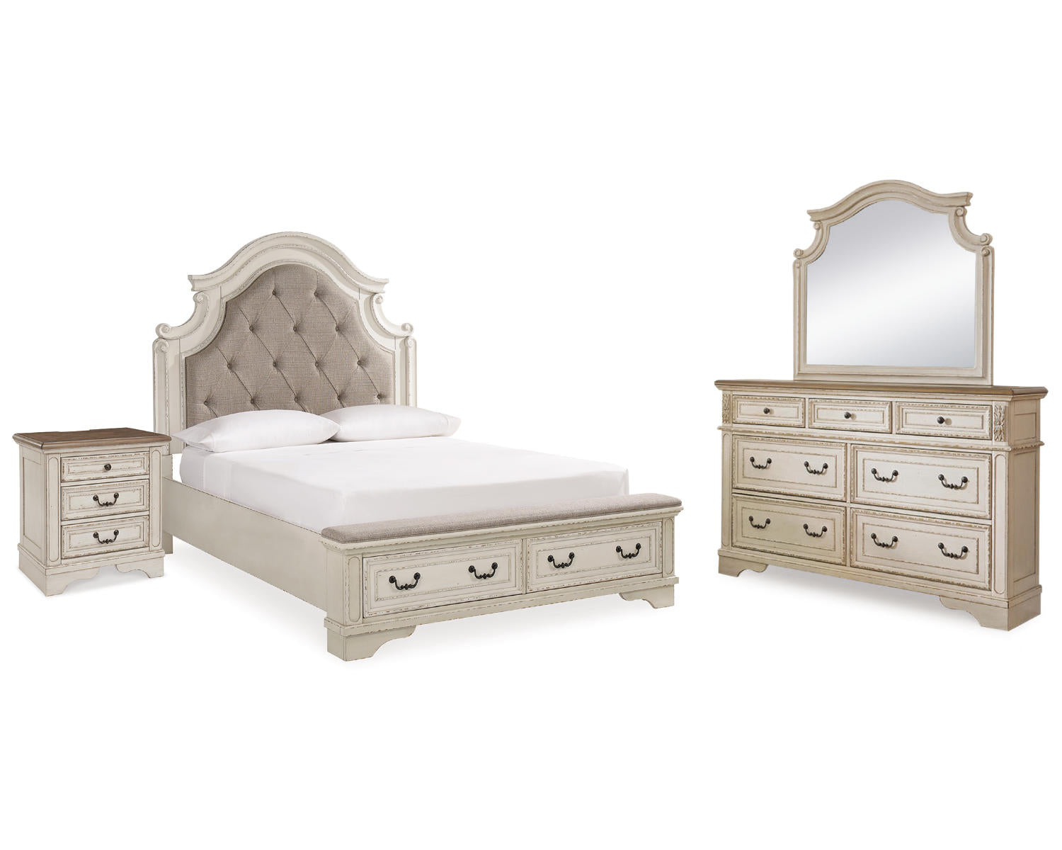 Realyn Queen Upholstery Panel Bed, Dresser, Mirror and Nightstand – Two-Tone Bedroom Set