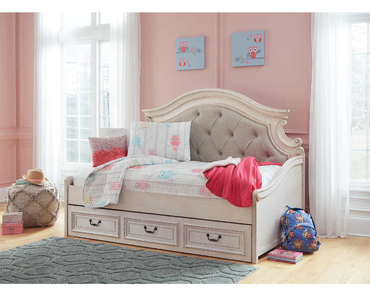 Meet the Realyn Twin Daybed—a smart, space-saving sleeping solution designed for bedrooms, guest rooms, and compact spaces. Finished in a versatile Chipped White, it blends clean lines with practical storage. The built-in 1 Large Storage Drawer helps keep blankets, linens, and essentials neatly tucked away without sacrificing floor space.