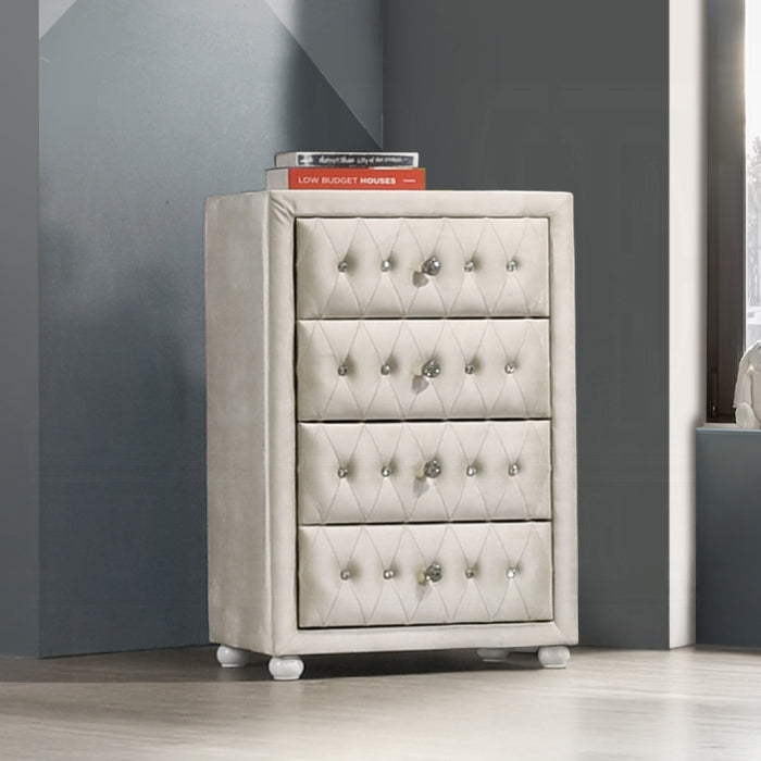 Enter the sophisticated realm of the Reggie bedroom collection with the Reggie Chest. Wrapped in elegant gray fabric, this piece brings quiet luxury to any bedroom. Designed for those who value serene, stylish storage, it pairs timeless design with everyday practicality.