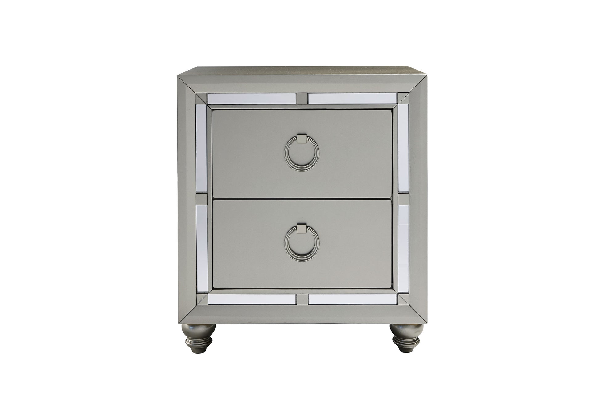The Riley Silver Nightstand is a contemporary bedside essential designed for modern bedrooms. It offers a clean silhouette and a convenient surface for lamps, books, and nighttime essentials. Built to fit in tight spaces without sacrificing style, it blends practicality with a subtle, refined aesthetic.