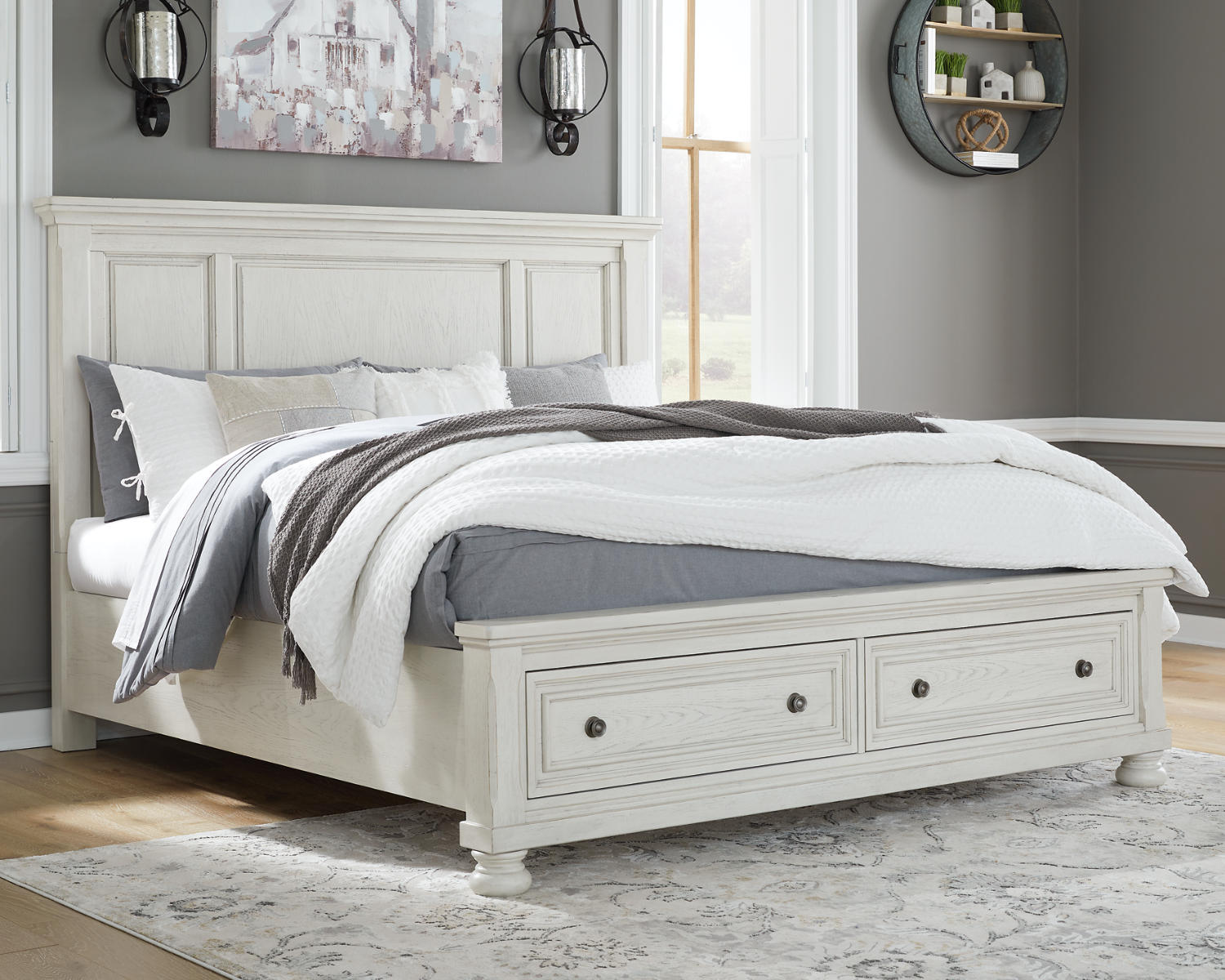 Robbinsdale King Panel Storage Bed, Dresser and Mirror – Antique White