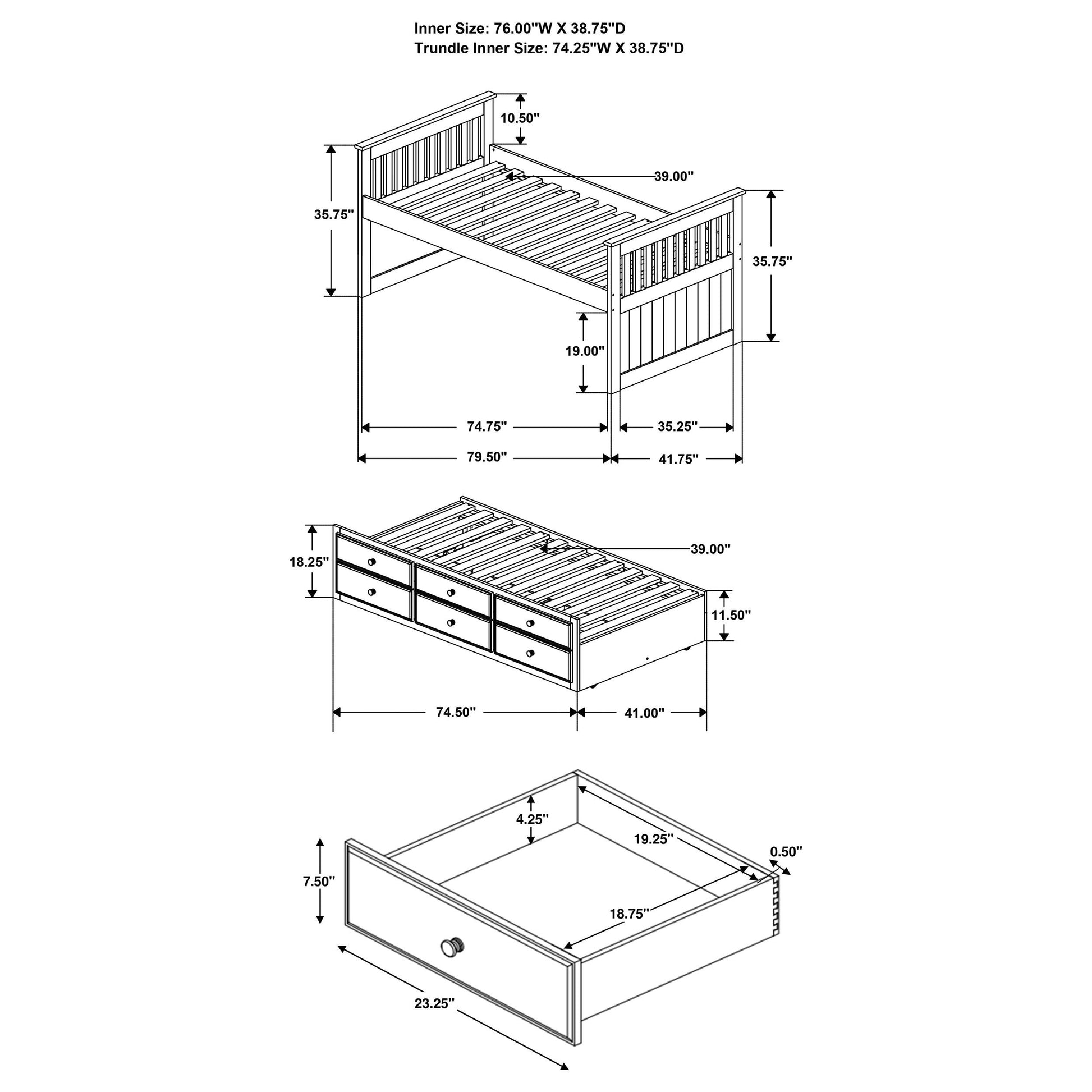 - Three integrated drawers provide ample under-bed storage for clothing, toys, or linens.