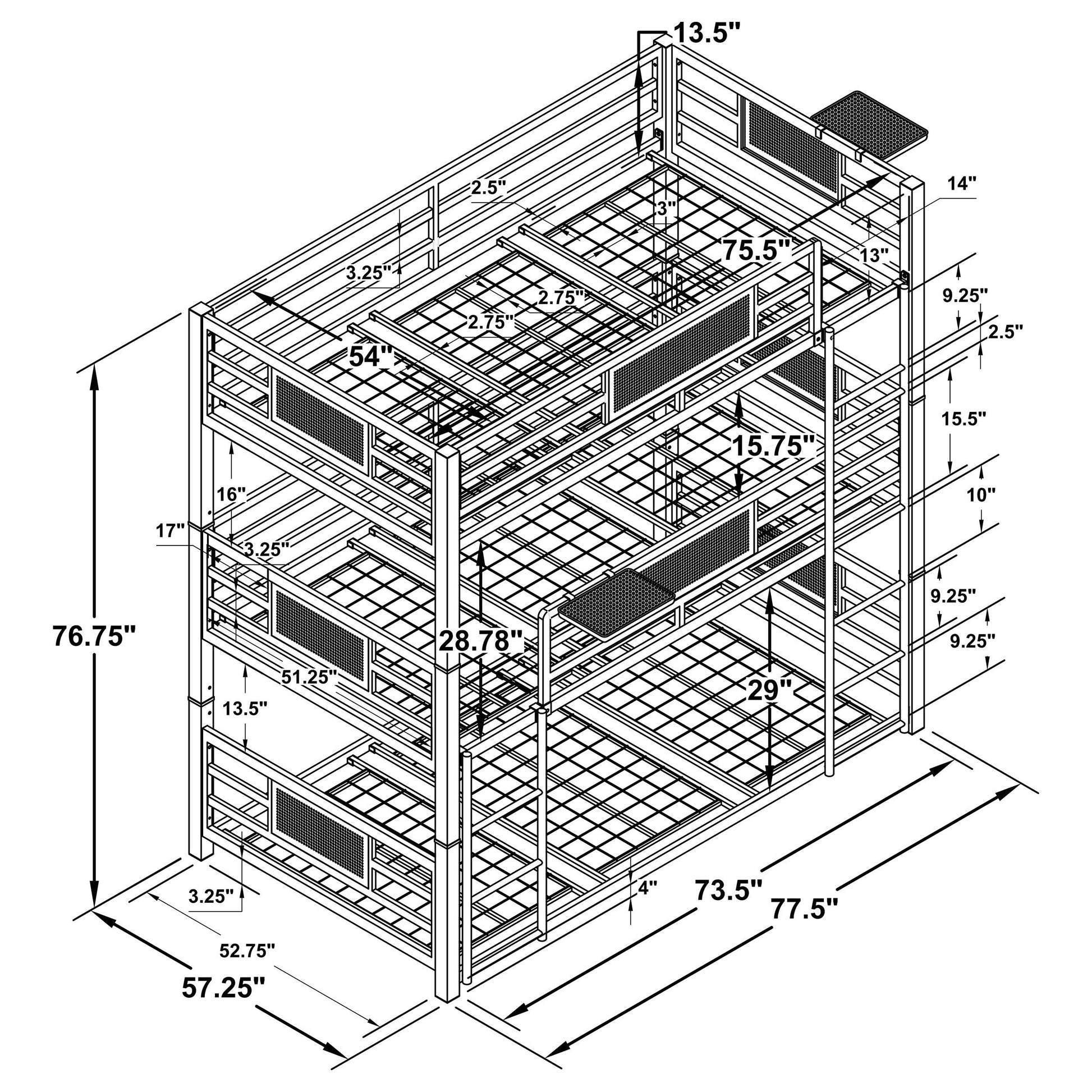 - Triple bunk configuration with three full-size beds stacked vertically for efficient use of room space.