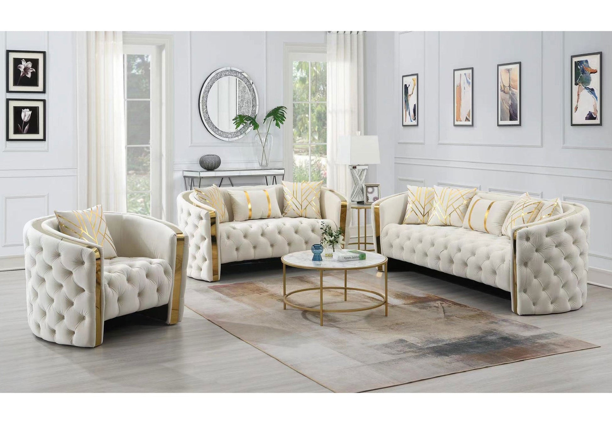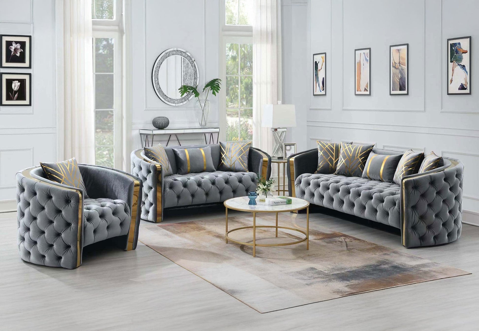 Introducing the Rolex III Collection, a living room set that blends bold luxury with modern elegance. This set is designed for those who appreciate distinctive silhouettes, premium tufting, and plush velvet textures. Wrapped in plush gray velvet with golden edge accents, it creates a regal focal point in any living space.