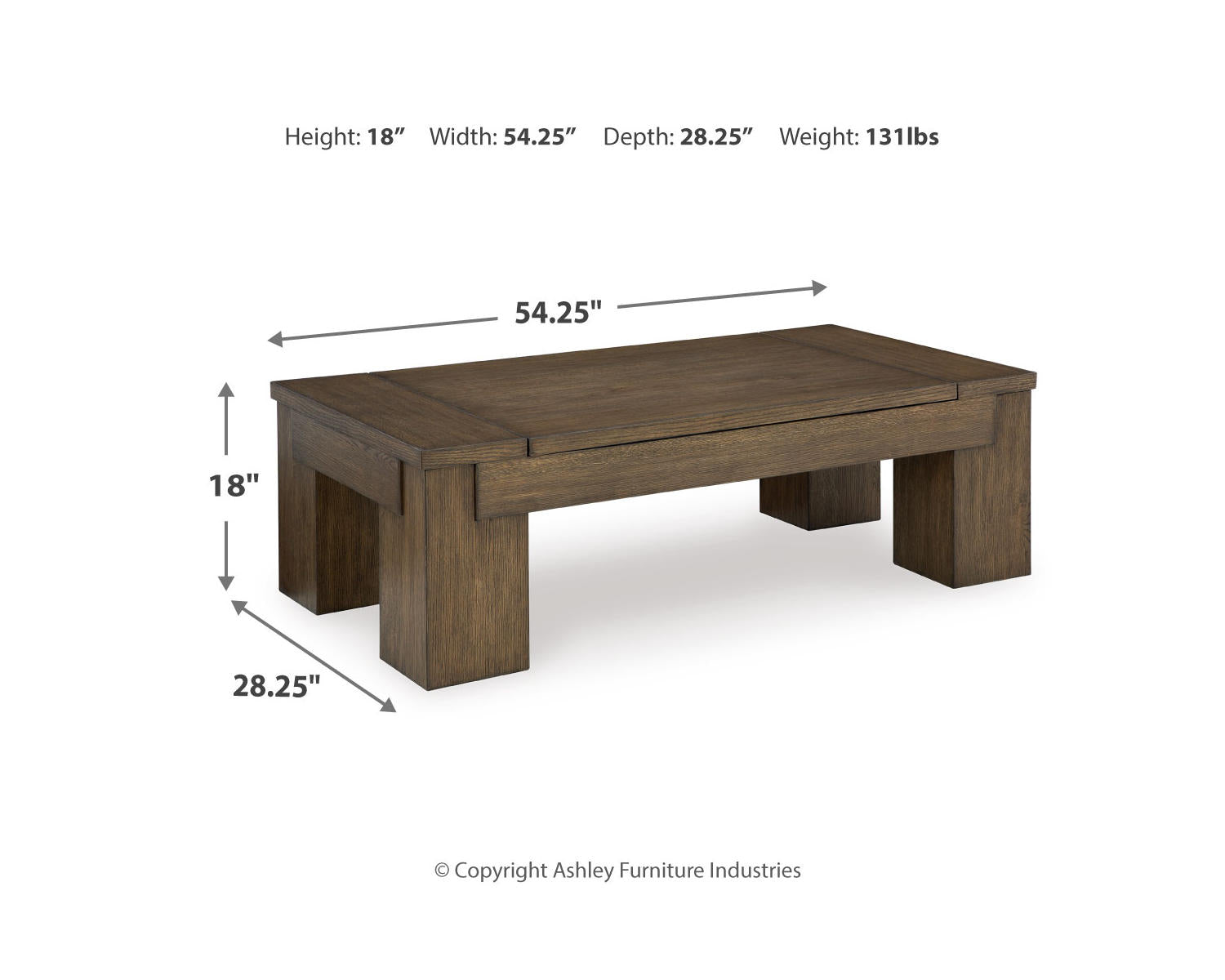 - Lift-top coffee table with a smooth mechanism that raises the tabletop to reveal hidden storage for remotes, magazines, and essentials.