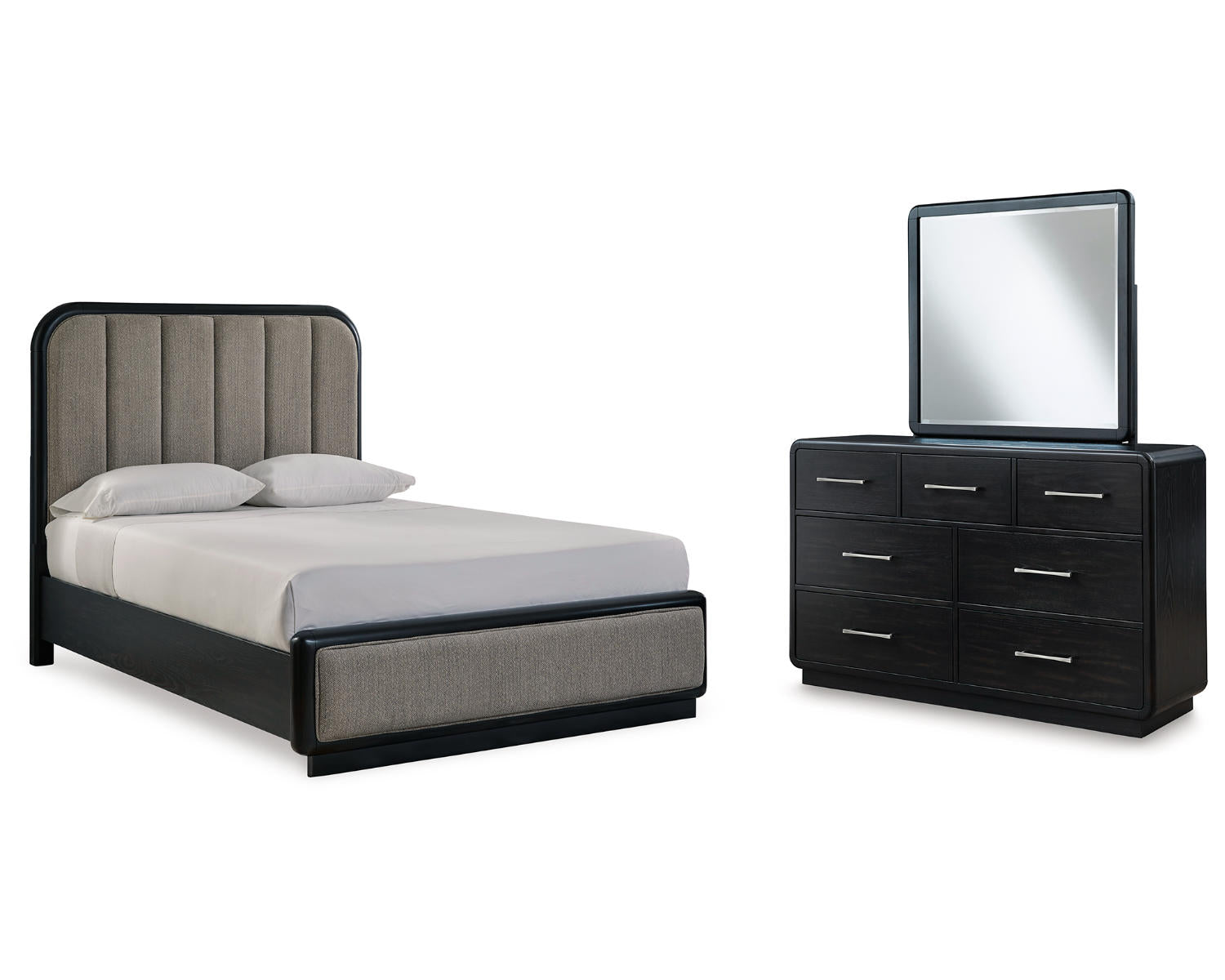 Rowanbeck Queen Upholstered Panel Bed, Dresser and Mirror — Black