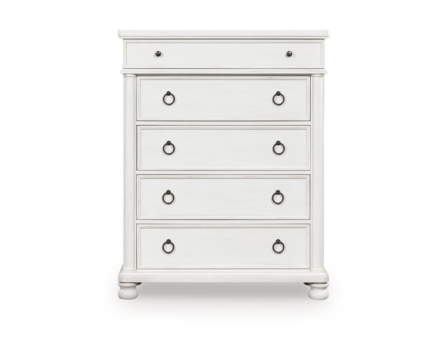 The Rowlenstown Five Drawer Chest in Antique White is a practical storage solution that blends classic style with everyday function. Designed for bedrooms, guest rooms, or entryways, it keeps clothes, accessories, and essentials neatly organized while adding a touch of timeless charm.