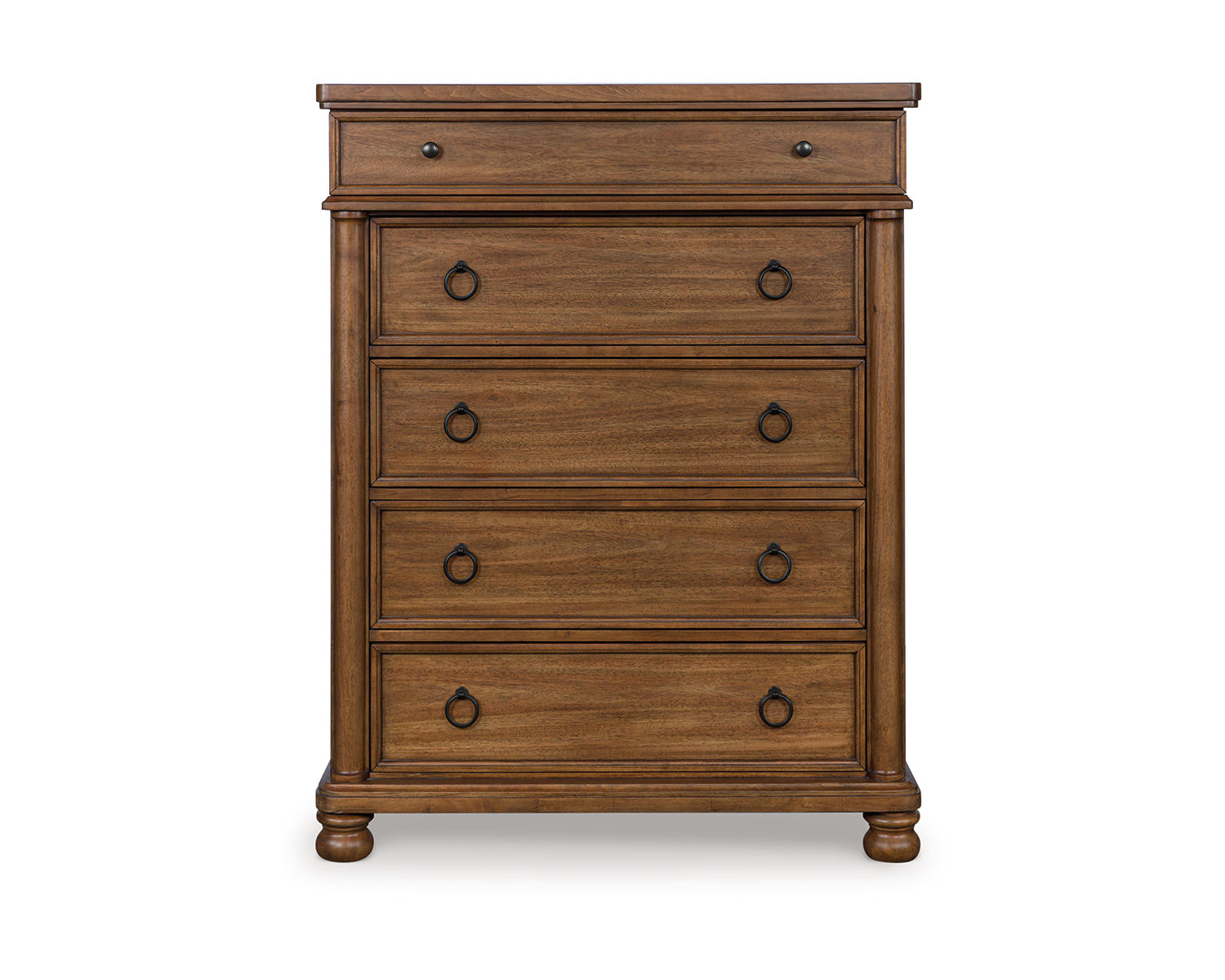 The Rowlenstown Chest of Drawers is a five-drawer storage solution crafted in a warm brown finish. Designed for bedrooms and guest spaces, it blends classic style with practical organization to keep clothes, accessories, and small items neatly tucked away. Built for everyday use, it offers reliable storage without sacrificing clean, timeless aesthetics.