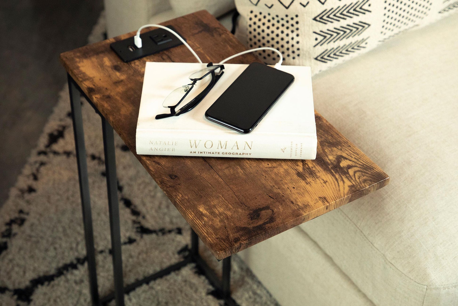 Rudy C-Shaped Side Table with Power Outlet – Antique Brown