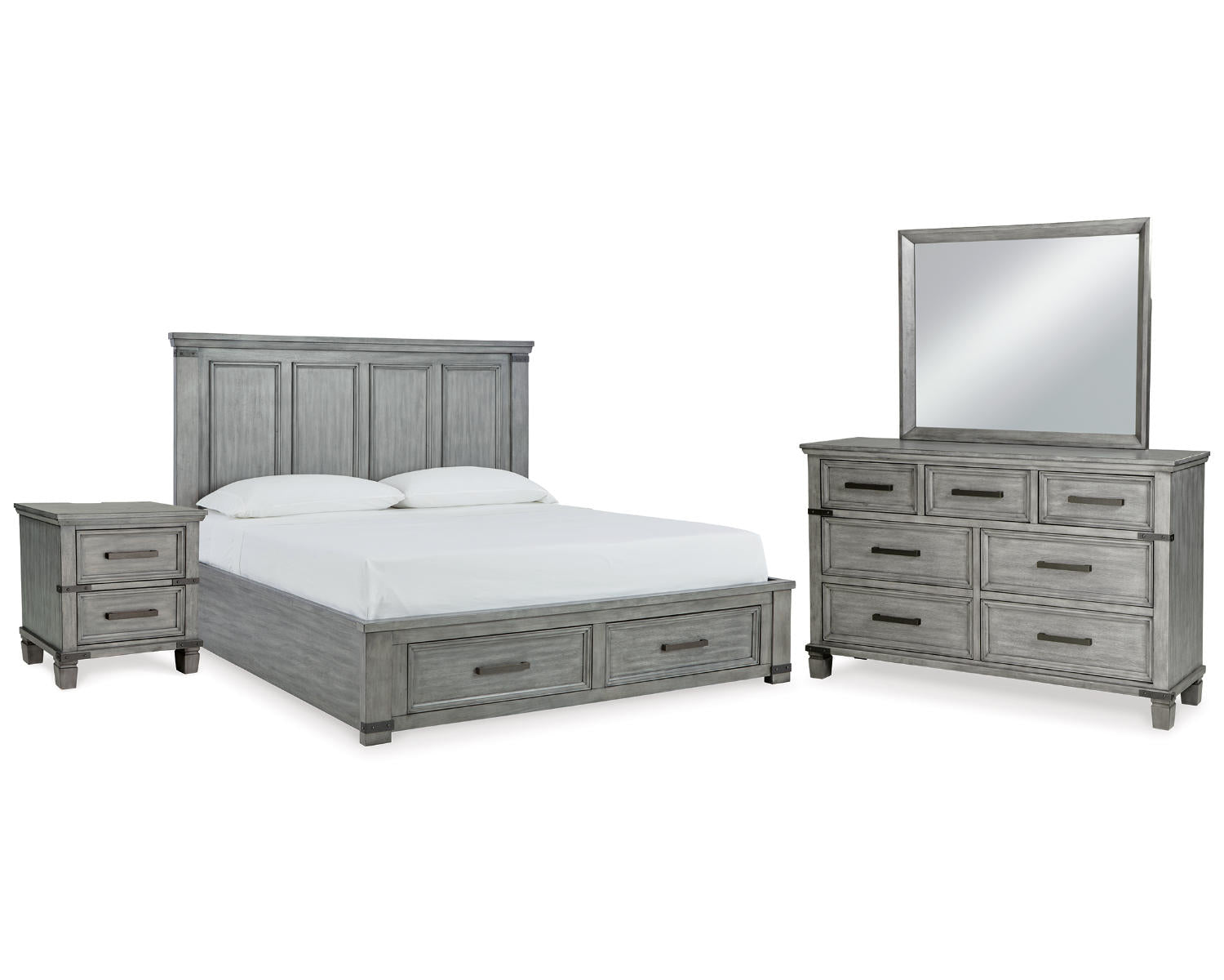 Russelyn King Panel Storage Bed, Dresser, Mirror and 2 Nightstands — Gray