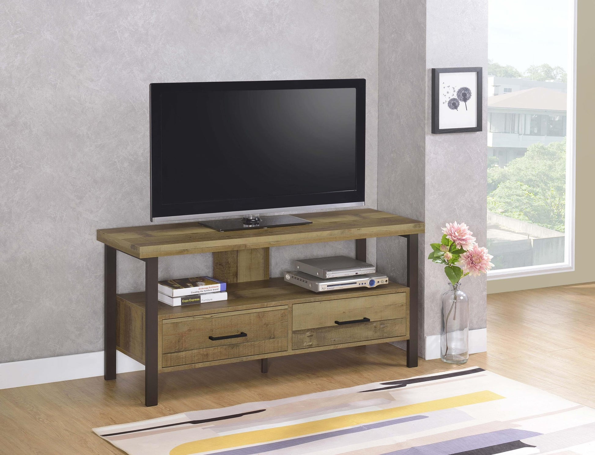 The Ruston 2-drawer TV stand blends practical storage with a weathered pine finish, designed for living rooms and media spaces. Built to support modern entertainment setups, this piece combines form and function in a compact 48-inch footprint.
