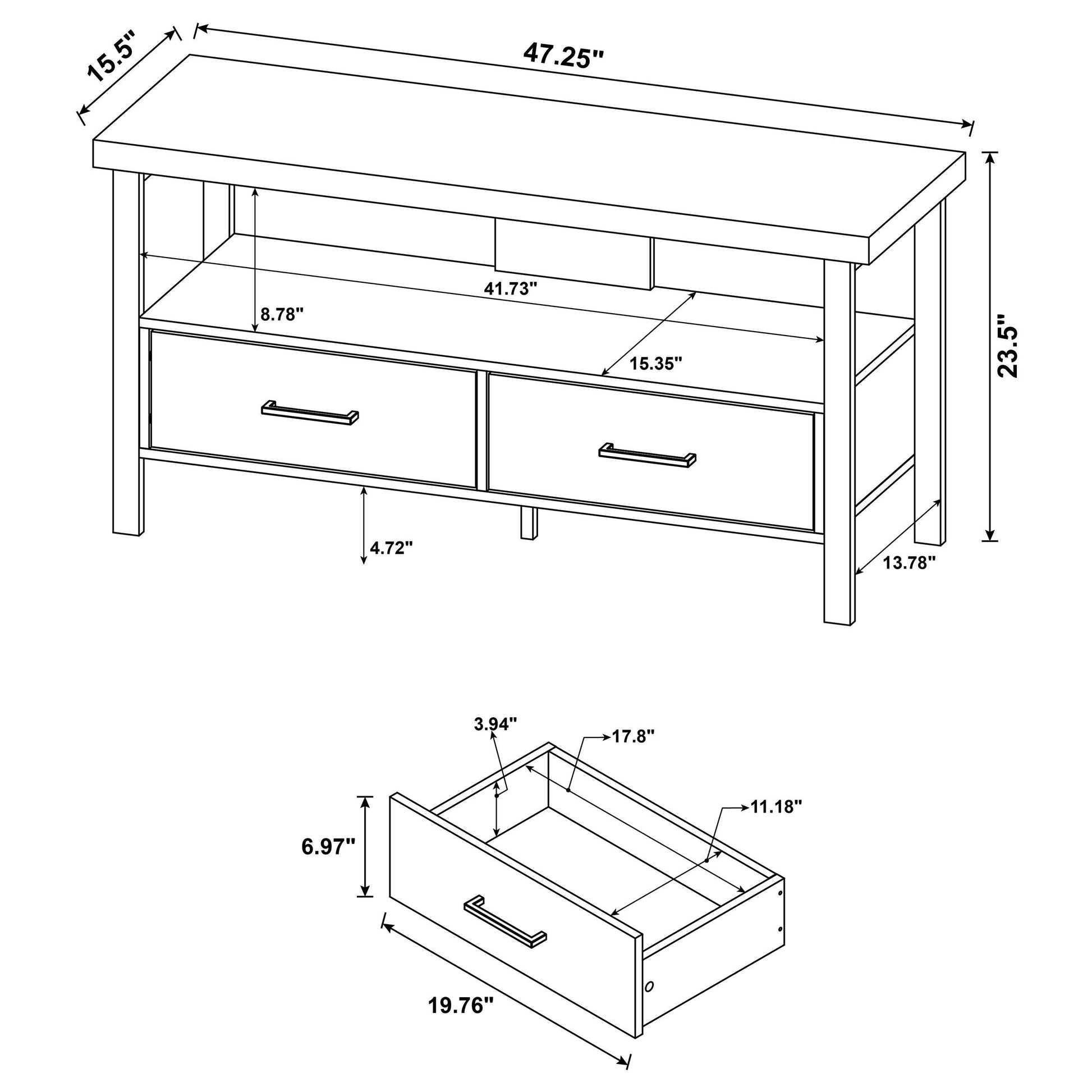 - Storage: 2 drawers for concealed storage of remotes, cables, and small accessories.
