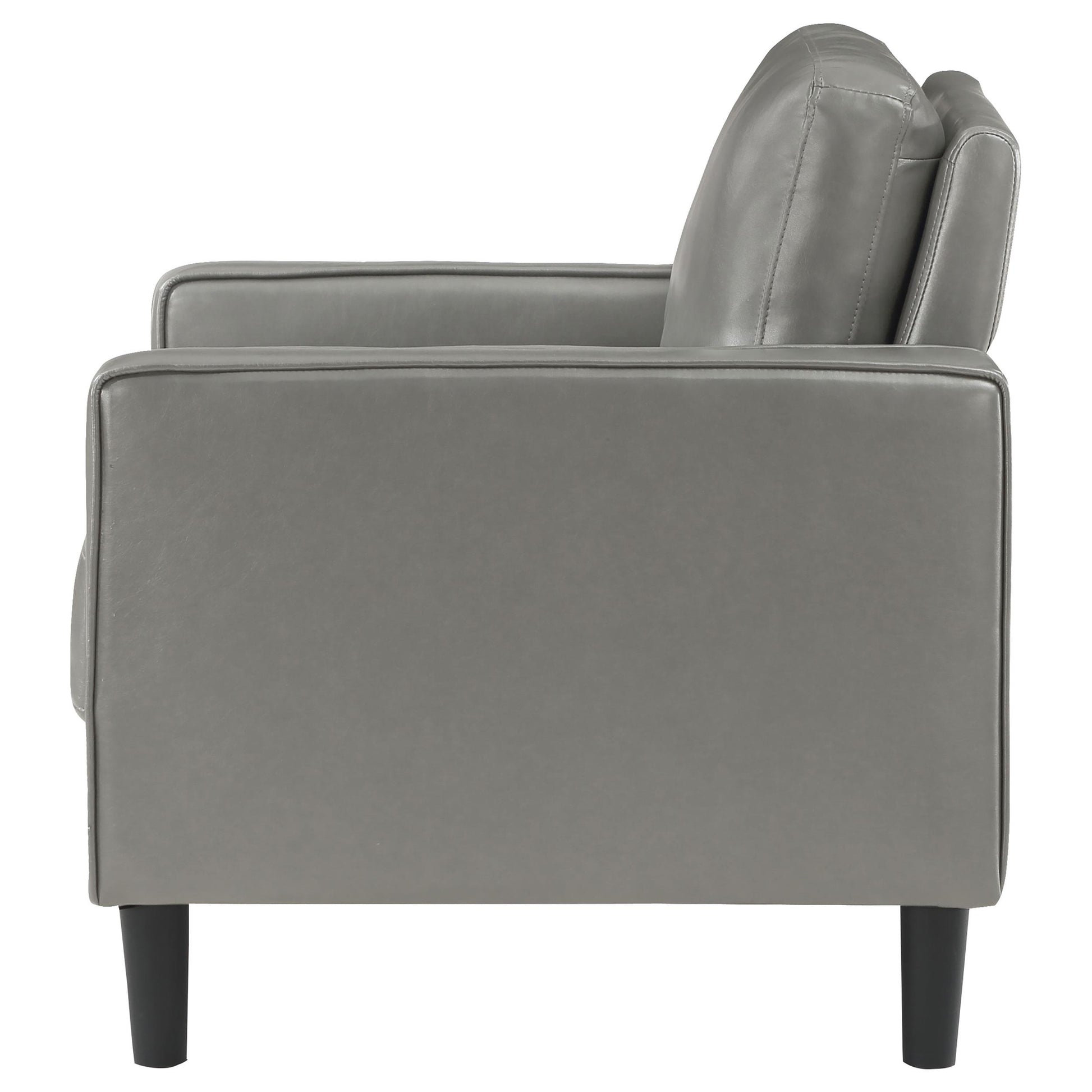 Meet the Ruth Upholstered Track Arm Accent Chair in Grey: a versatile seating piece designed to fit a variety of rooms. It blends clean lines with comfortable, everyday seating, making it ideal for living rooms, bedrooms, or entryways.