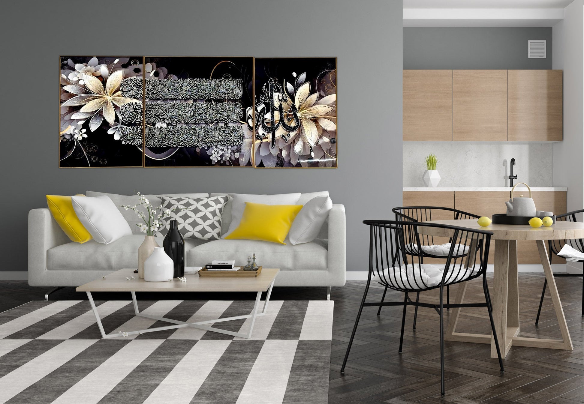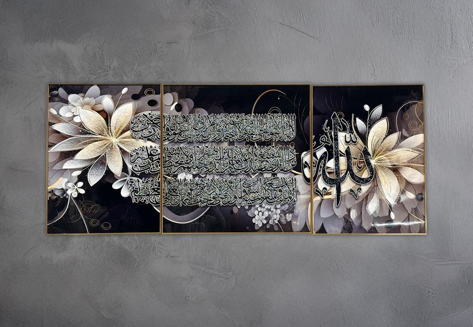 Inspired by sacred verses, this intricately designed triptych blends spirituality with artistic elegance. The composition features golden floral patterns intertwined with Arabic calligraphy, creating a tranquil focal point for any space. Perfect for living rooms, meditation corners, or galleries seeking a statement piece.
