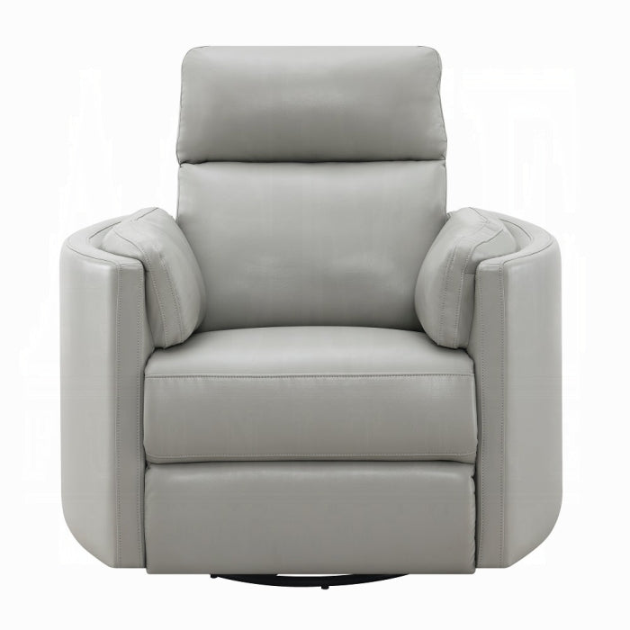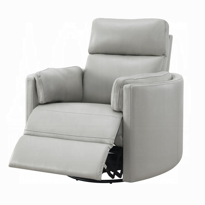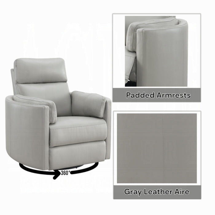Discover the Sagen gray leather-aire recliner—a stylish chair designed for living rooms and office spaces. It blends trend-forward design with practical function, offering a glider, swivel, and body-weight–driven recline for effortless comfort.