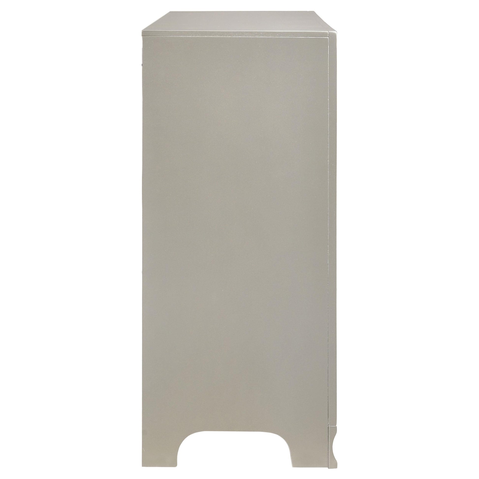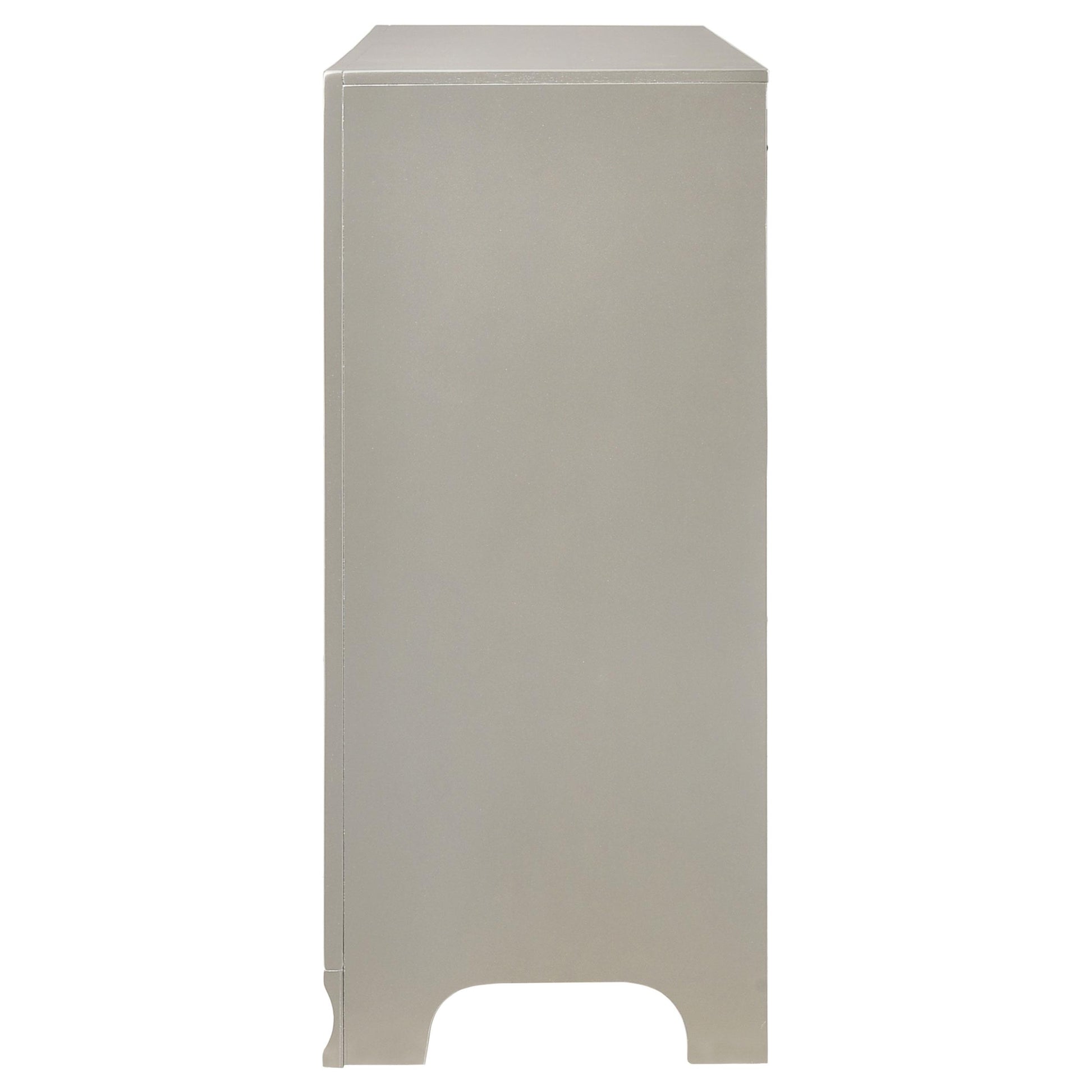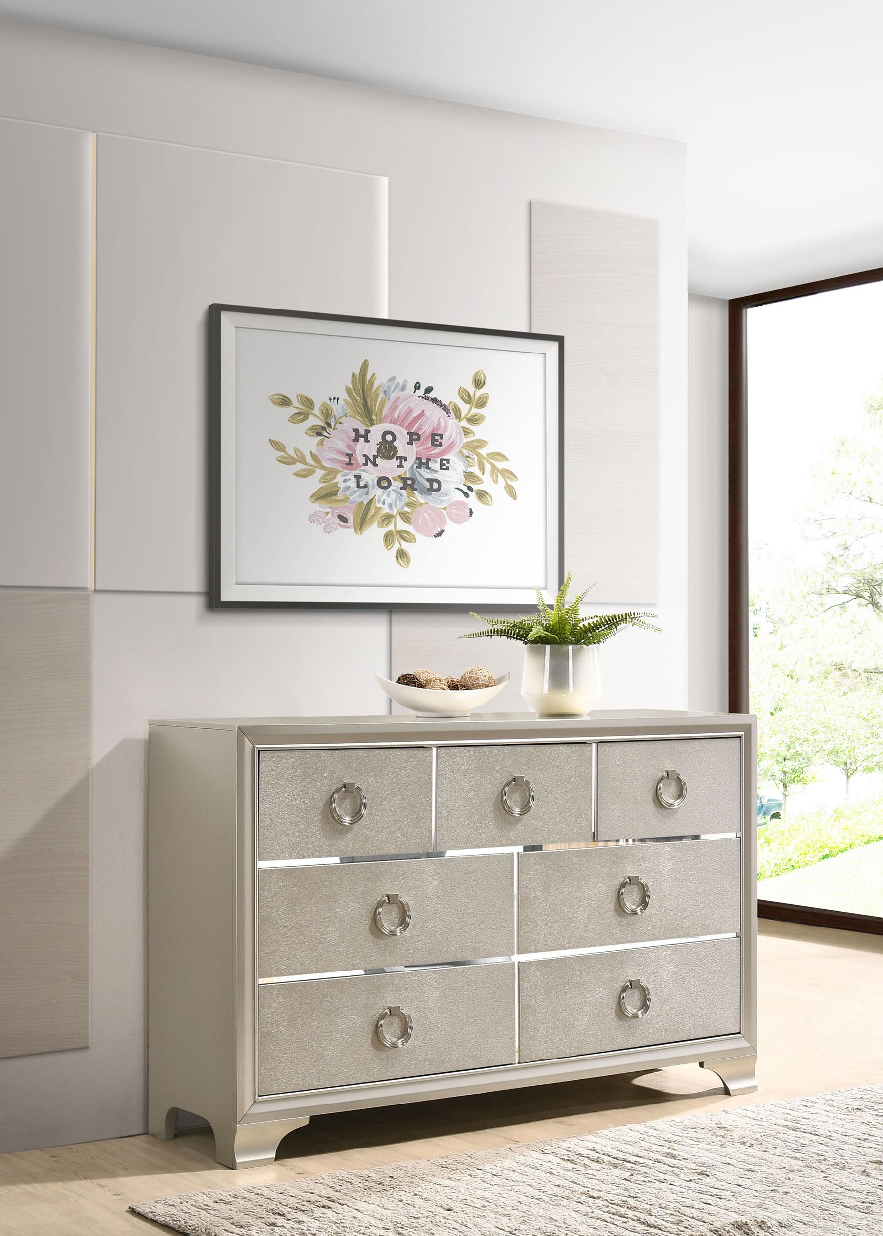 Designed for bedrooms, the Salford 7-drawer Dresser in Metallic Sterling offers organized storage with a modern touch. It's a practical choice for anyone seeking reliable, stylish storage that fits a range of decor styles. The metallic Sterling finish brings a contemporary vibe to your space, while seven drawers provide ample room for clothes, accessories, and linens.