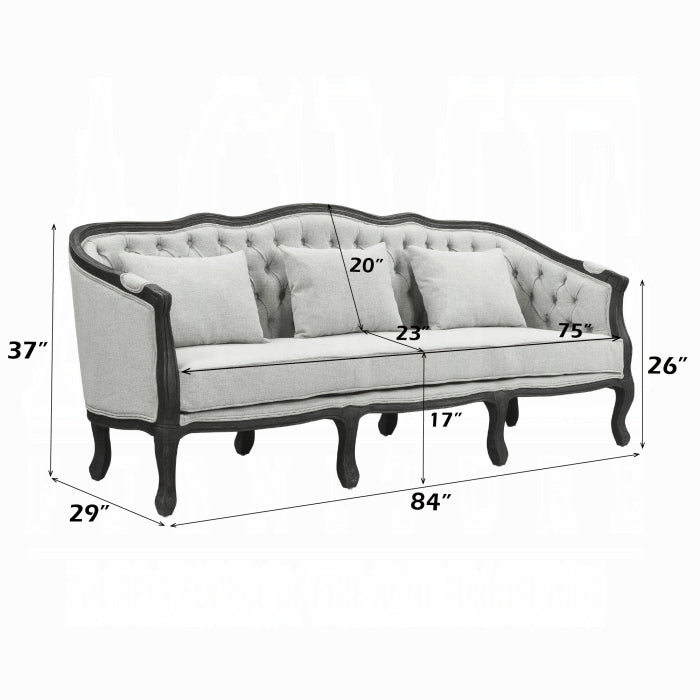 With a nod to vintage French design, the Samael is a modern interpretation of a camel-back sofa. Its exposed, beautifully carved wooden frame wraps you in comfort. The curved silhouette sits on carved cabriole legs, elevating style while inviting easy lounging. Enveloped in gray upholstery, it blends seamlessly with a range of interiors and adds a touch of refined elegance to living rooms or seating areas.