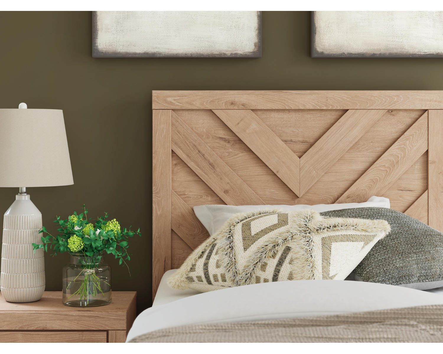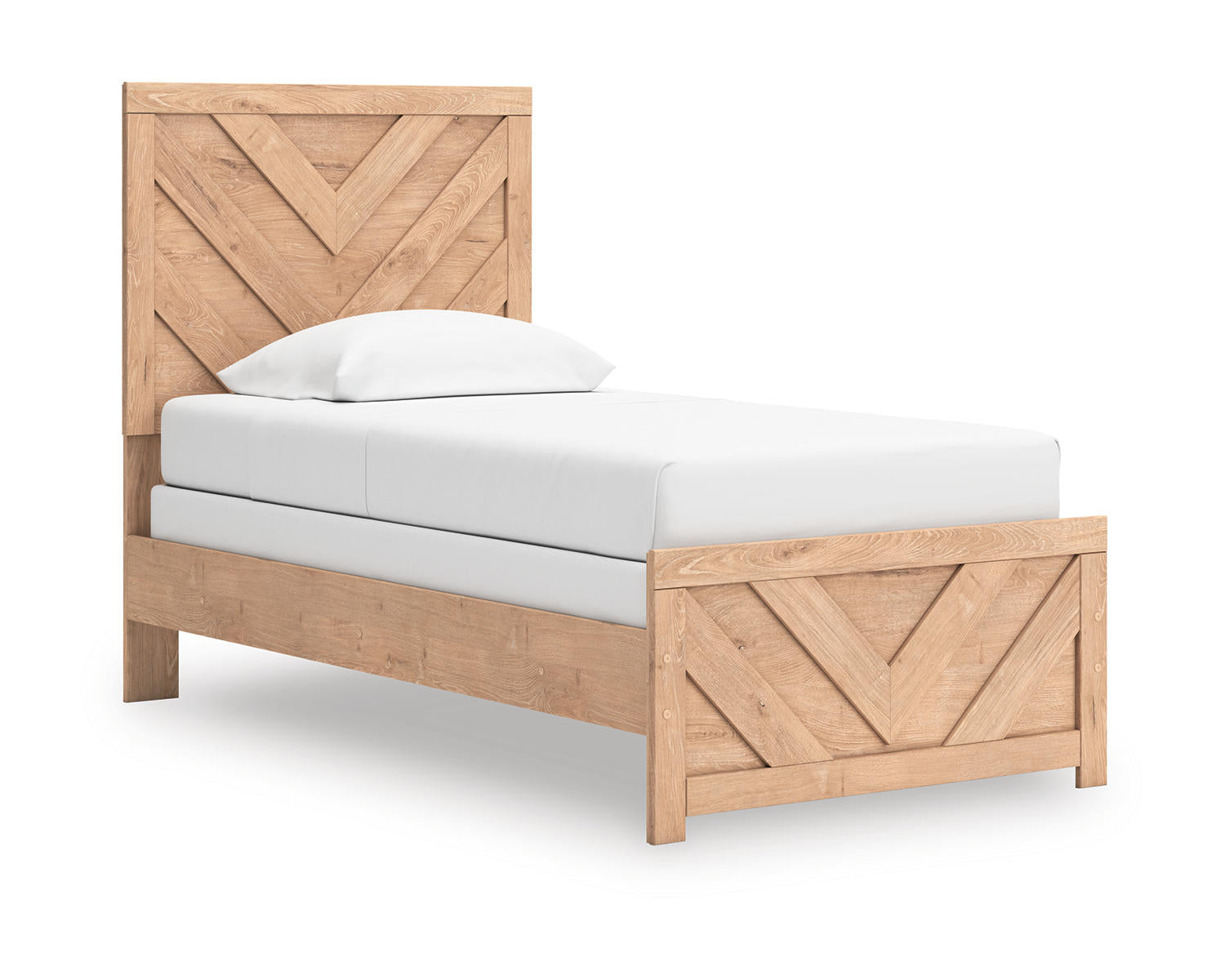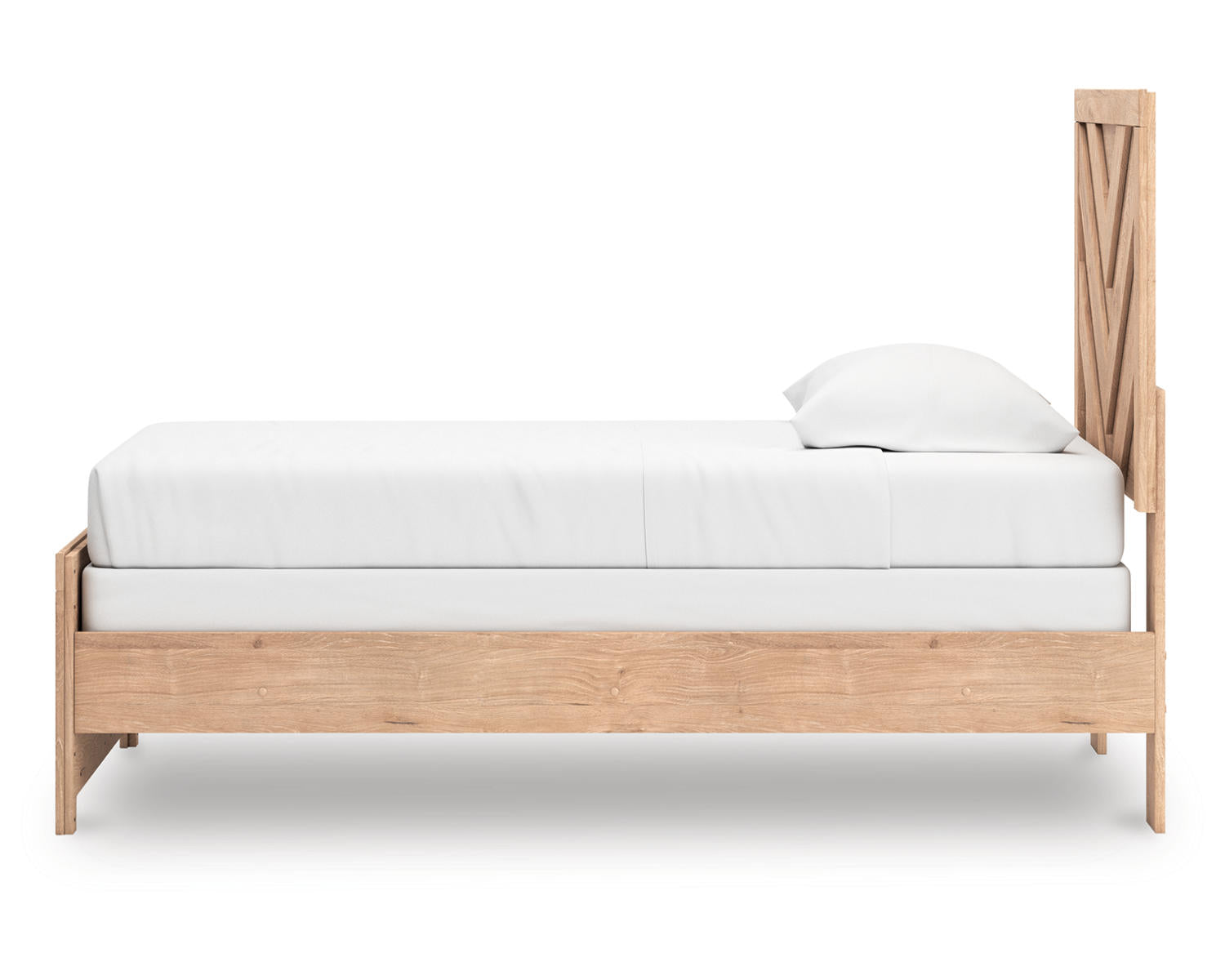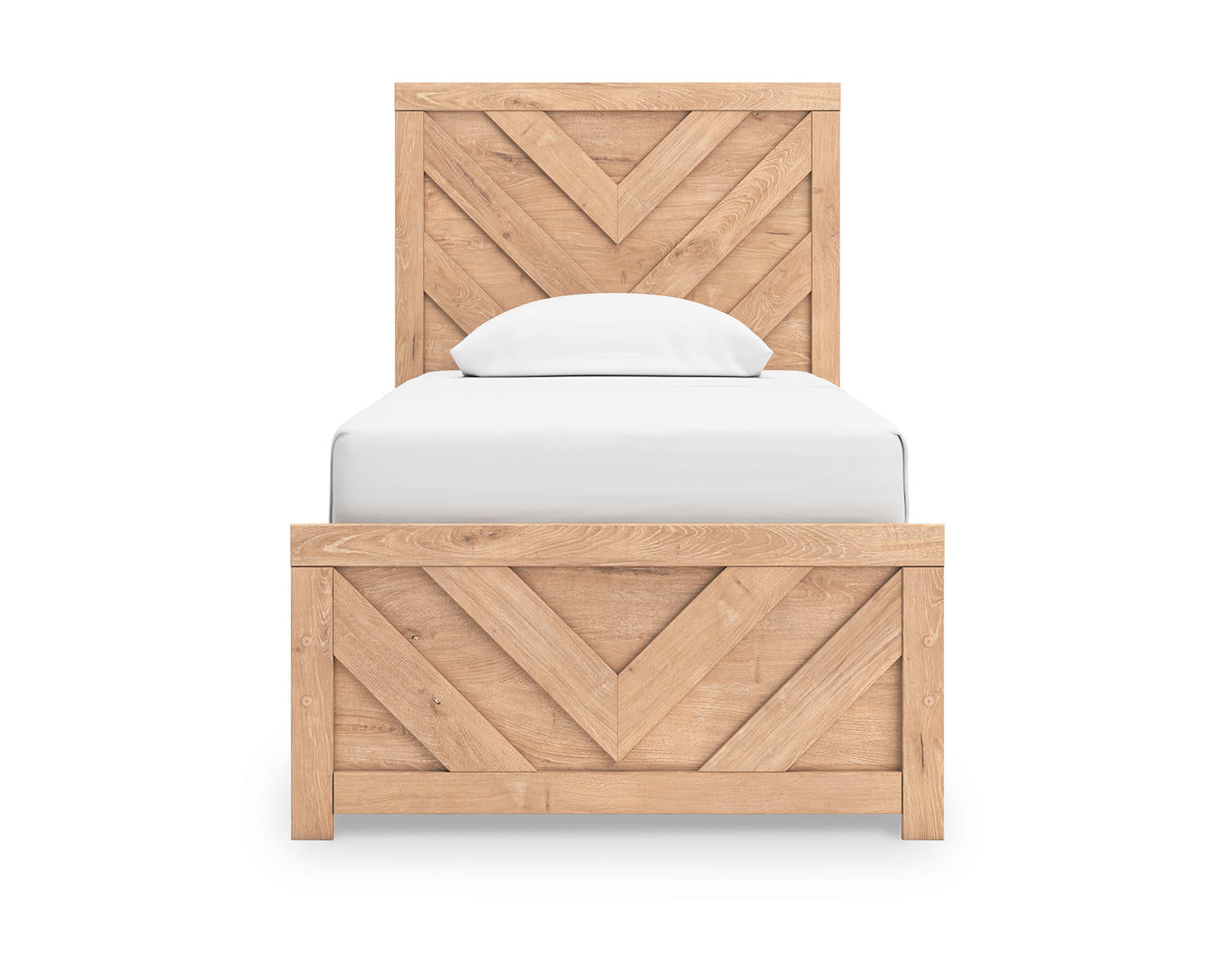 The Sanginlane Twin Panel Bed is a versatile twin-size bed frame finished in a warm tan. It's designed for bedrooms that want a clean, classic look with lasting comfort. Ideal for kids' rooms, guest rooms, or shared spaces, this bed brings a timeless silhouette to any decor.