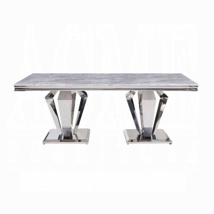 Contemporary flair meets timeless silhouettes in the Satinka Dining Table, a centerpiece designed to blend with any home style. Its refined mix of form and function makes it ideal for modern dining spaces, from casual weeknight meals to special occasions. A balanced pairing of a light gray faux marble top with a stainless steel pedestal base delivers a sophisticated, durable statement for your dining room.