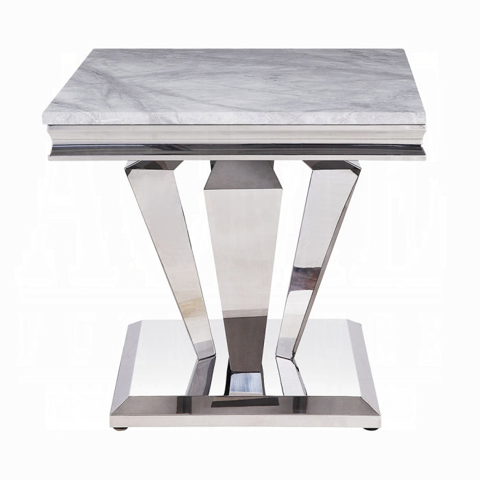 The light grey marble top offers an elegant surface, while the table base showcases sleek, uncluttered lines and shiny stainless steel accents for a polished, updated look.