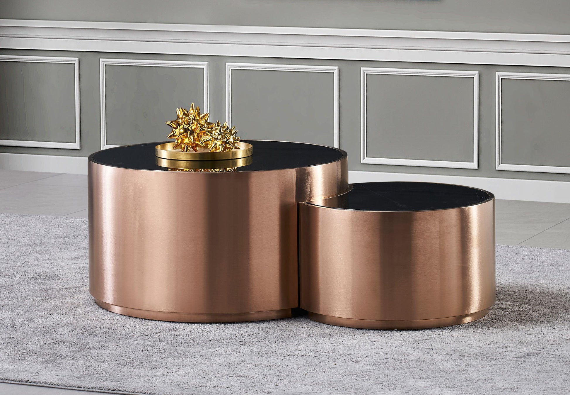 Add a touch of contemporary elegance to your living room with this stunning nesting coffee table set. Featuring a sleek round design, the larger and smaller tables come with brushed rose gold metal bases and smooth black tops, creating a luxurious and minimalist aesthetic. Perfect for versatile styling in modern spaces, this set blends form and function for everyday living.