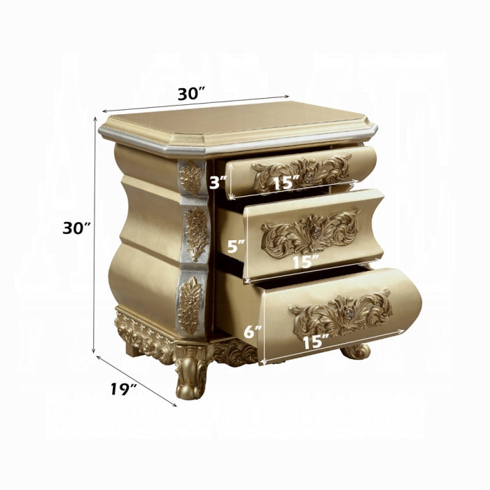 Introducing the Seville Nightstand, a luxe bedroom accent designed for lovers of timeless elegance. Its intricately hollow carved design and romantic scrolling accents lend drama and refinement to any space. Part of the Seville Bedroom Collection, this nightstand's dazzling gold hue enhances its detailed craftsmanship.