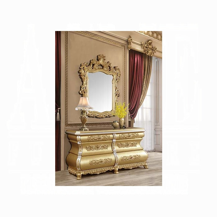 - Opulent detailing: luxuriously carved ornaments with a lustrous gold finish on a wooden frame set the room's tone.