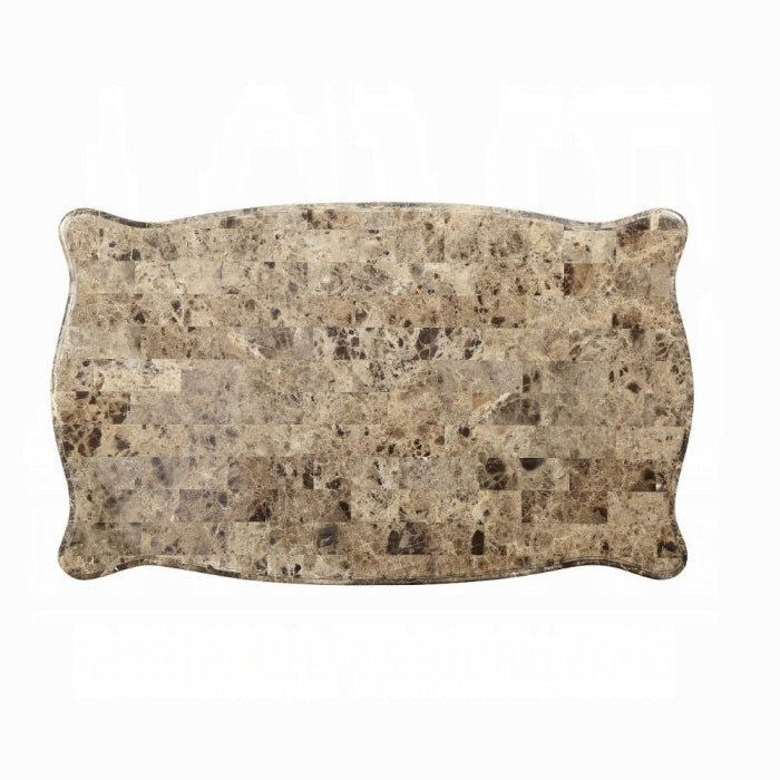 - Durable marble tabletop in a multi-tone brown finish creates a striking, easy-care surface.