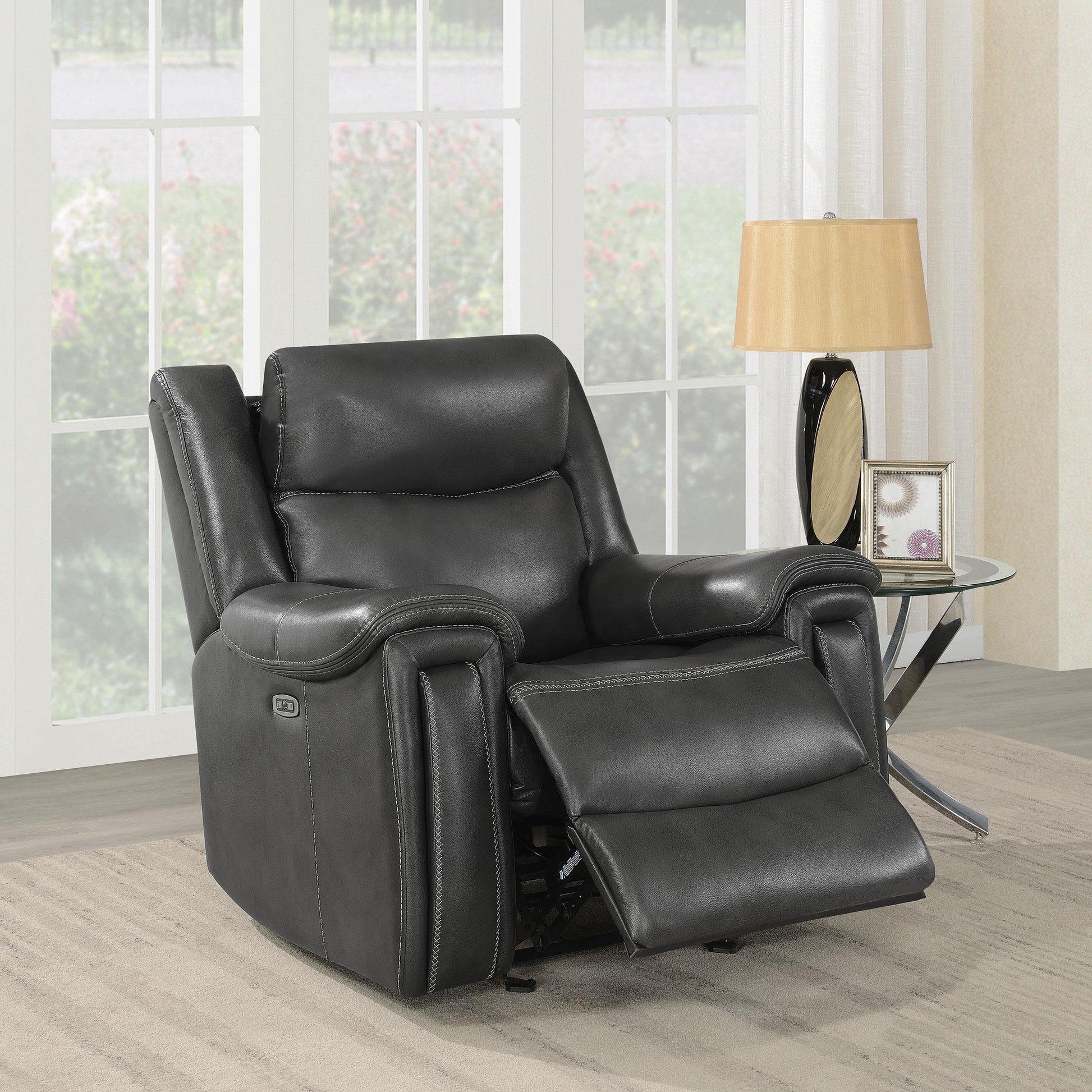 Experience premium comfort with the Shallowford Upholstered Power^2 Glider Recliner in Hand Rubbed Charcoal. This chair blends plush seating with intuitive powered reclining and a smooth gliding motion, making it ideal for living rooms, family spaces, or home theaters.