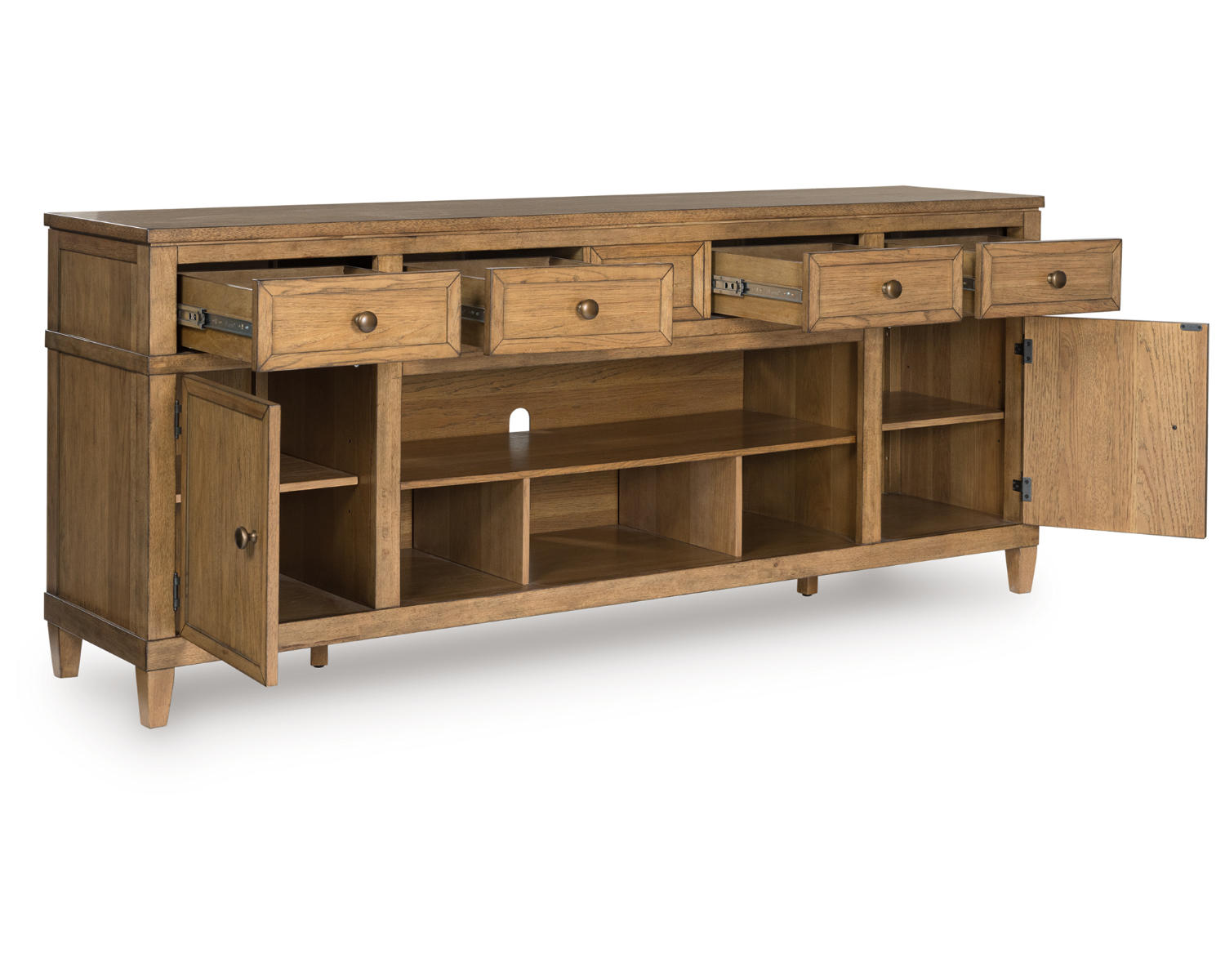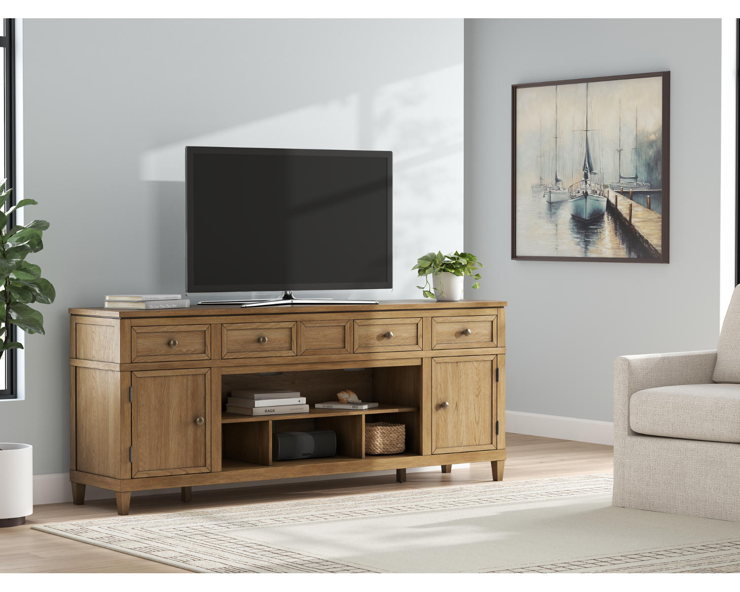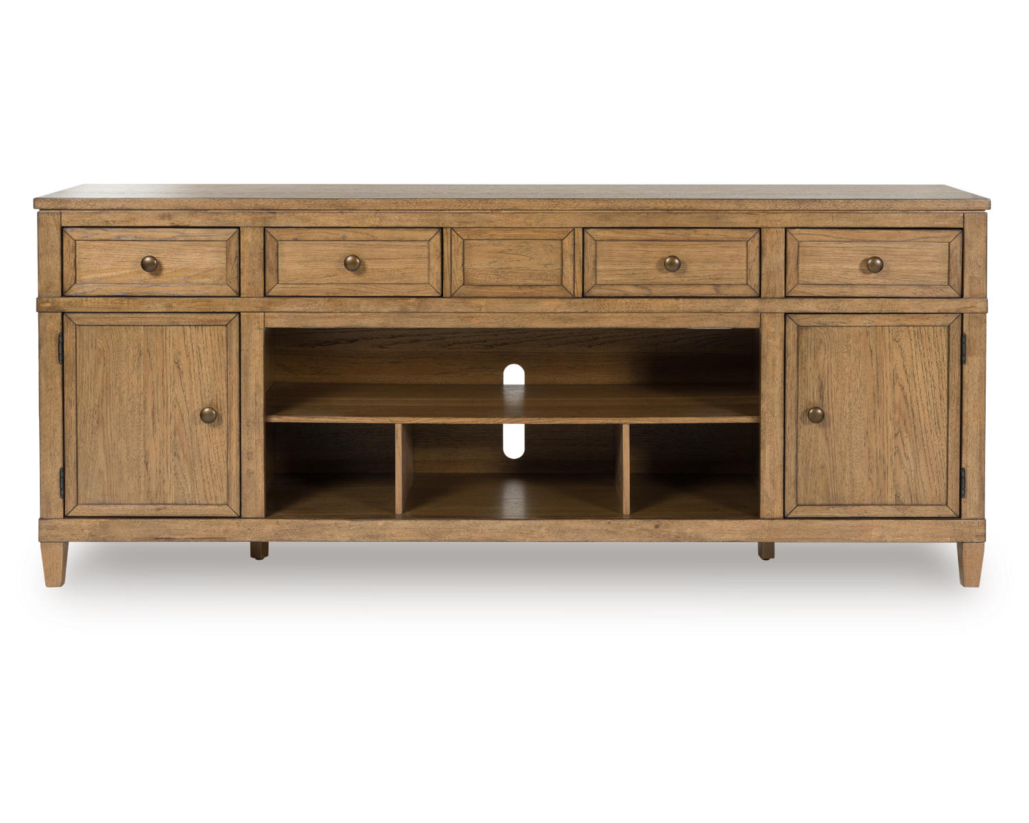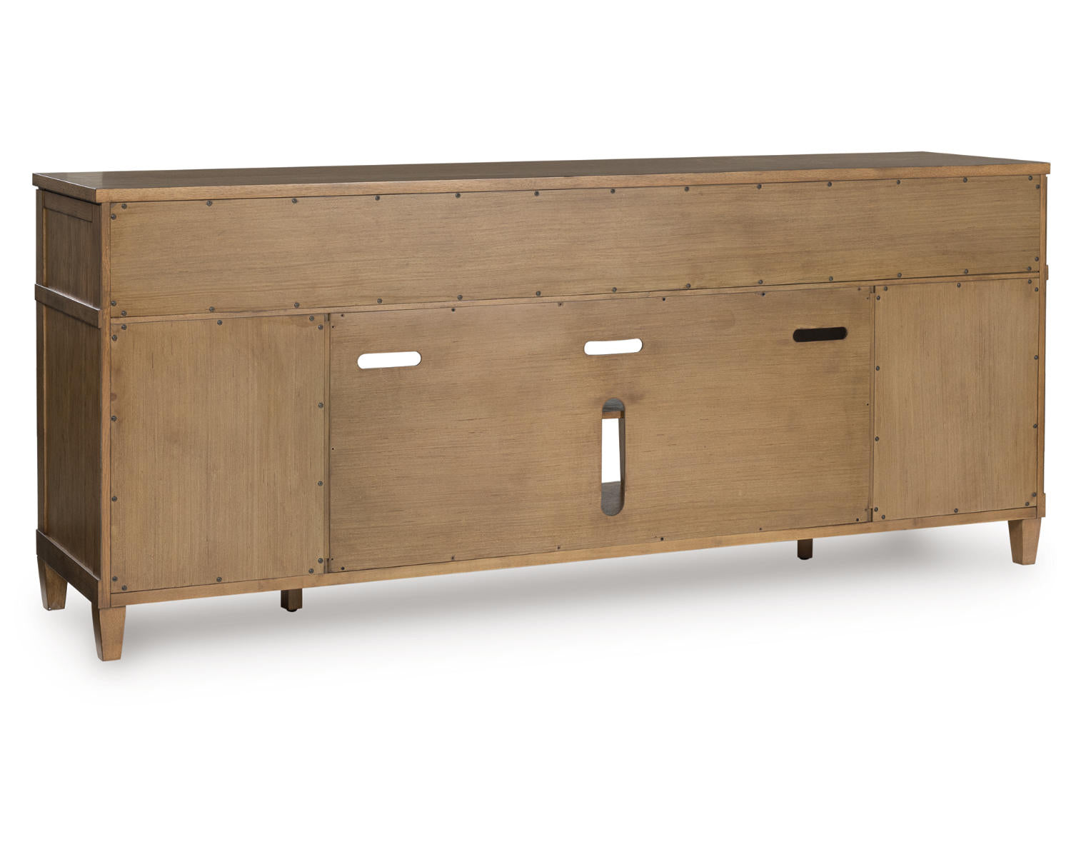 Meet the Sharlance 81" TV Stand, a versatile XL media console designed for spacious living spaces. It features a light brown finish and an optional fireplace feature to add warmth to your room. This stand is ideal for larger TVs and modern entertainment setups, offering a clean, streamlined silhouette.