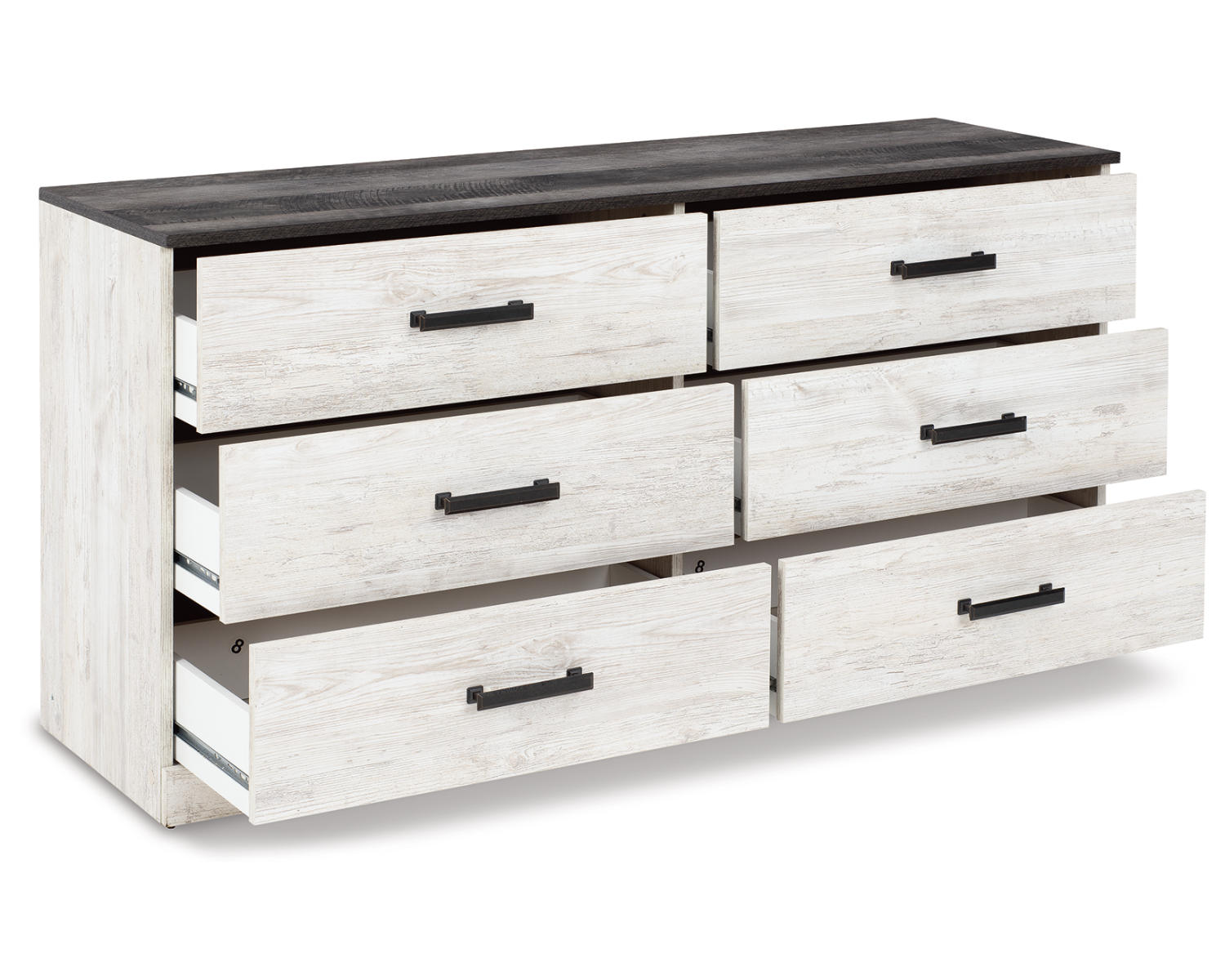 Meet the Shawburn Dresser, a six-drawer storage piece designed for organized bedrooms. This dresser blends a whitewash and charcoal gray finish for a contemporary look that fits a range of decors. Perfect for storing clothing, accessories, or linens, it keeps essentials within reach while maintaining a tidy space.