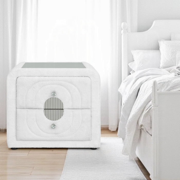 The Shelyn Nightstand is a contemporary bedside companion designed for those who value soft texture and clean lines. Featuring a White Teddy Sherpa finish with chrome accents, it adds warmth and subtle luxury to any bedroom. Built for everyday use, this nightstand blends comfort, style, and practicality in one compact piece.