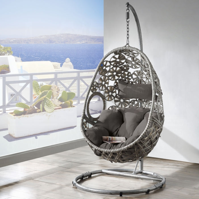 Introducing the Sigar Hanging Chair—a statement piece for any backyard setting. This modern patio chair with a stand is the perfect spot to snuggle up with a book or soak up the sunshine. Its distinctive shape makes a bold statement on its own. It is constructed utilizing all-weather wicker on rust-resistant sturdy steel.