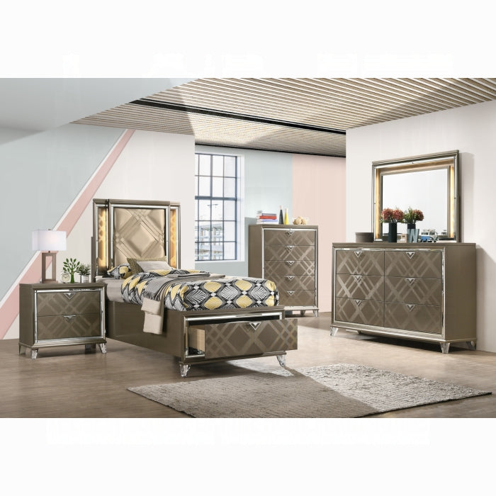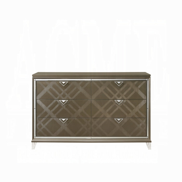 Elevate your bedroom with the Skylar Dresser, a modern glam storage piece designed for daily use and standout style. Embossed drawer fronts add texture and depth, while mirrored trim brings a touch of luxury. Finished in a fashionable dark champagne color, this dresser blends sophistication with practical storage for cosmetics and perfumes.