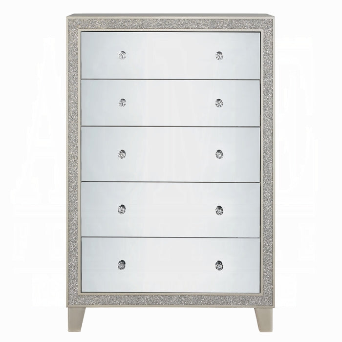 - Elegant mirrored front and champagne finish add a timeless, sophisticated touch to any decor.