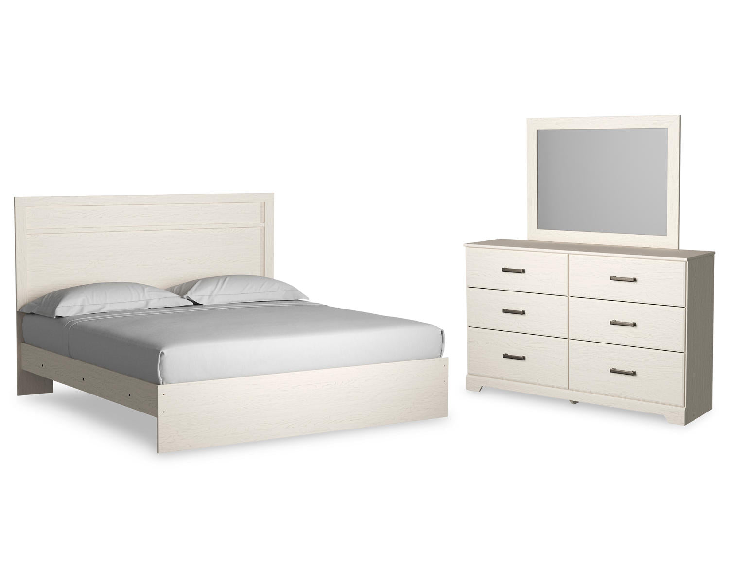 Meet the Stelsie King Panel Bed, Dresser and Mirror in a crisp white finish. This three-piece bedroom set is designed for those who want a cohesive, timeless look with minimal effort. The collection pairs a king panel bed with a spacious dresser and a matching mirror to create a serene, coordinated retreat.