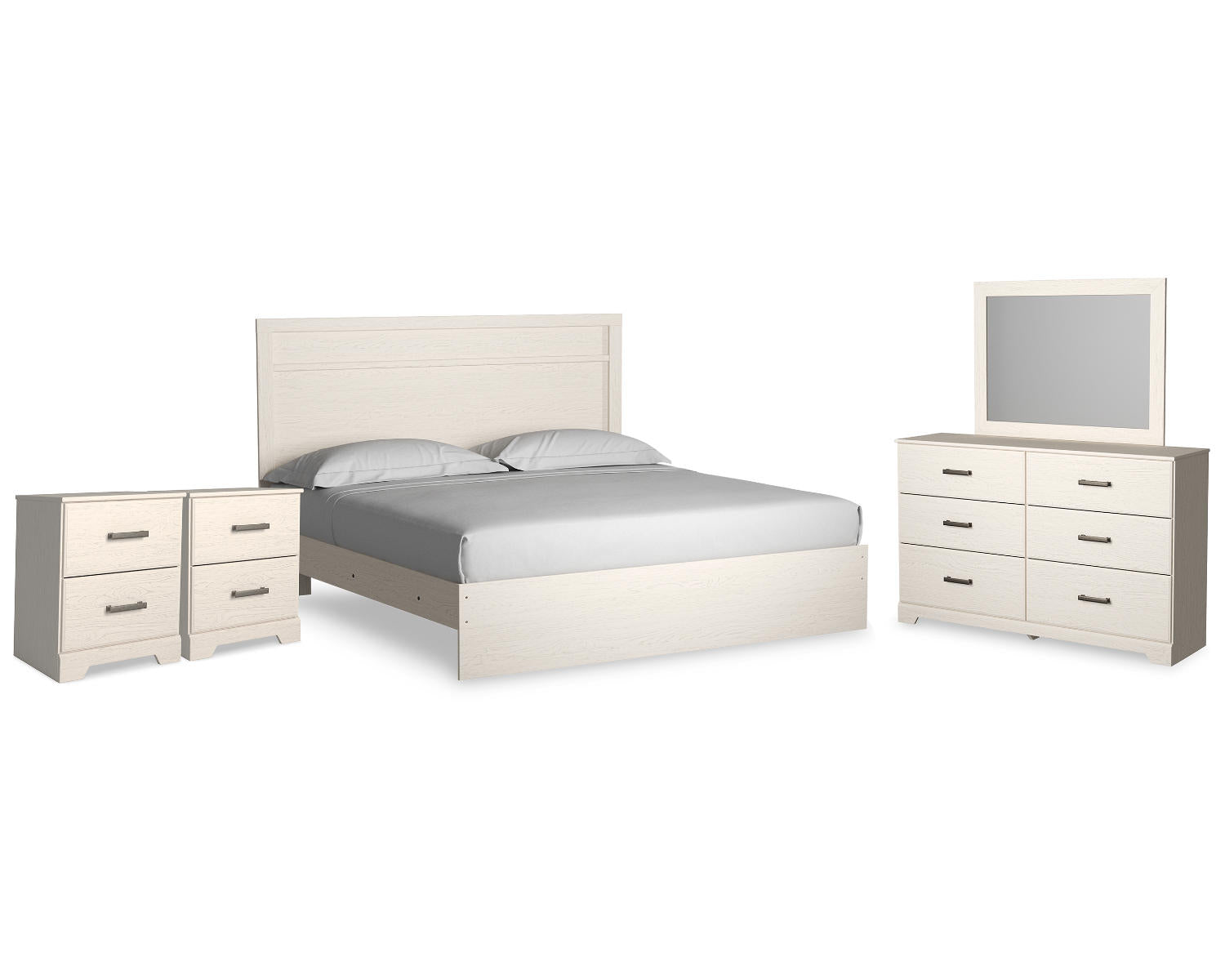 The Stelsie King Panel Bed, Dresser, Mirror and Nightstand is a complete four-piece bedroom suite designed for modern master bedrooms and guest rooms alike. This coordinated set offers a cohesive, timeless look with clean lines and practical storage. It’s a versatile choice for anyone seeking a coordinated, easy-to-live-with bedroom solution.
