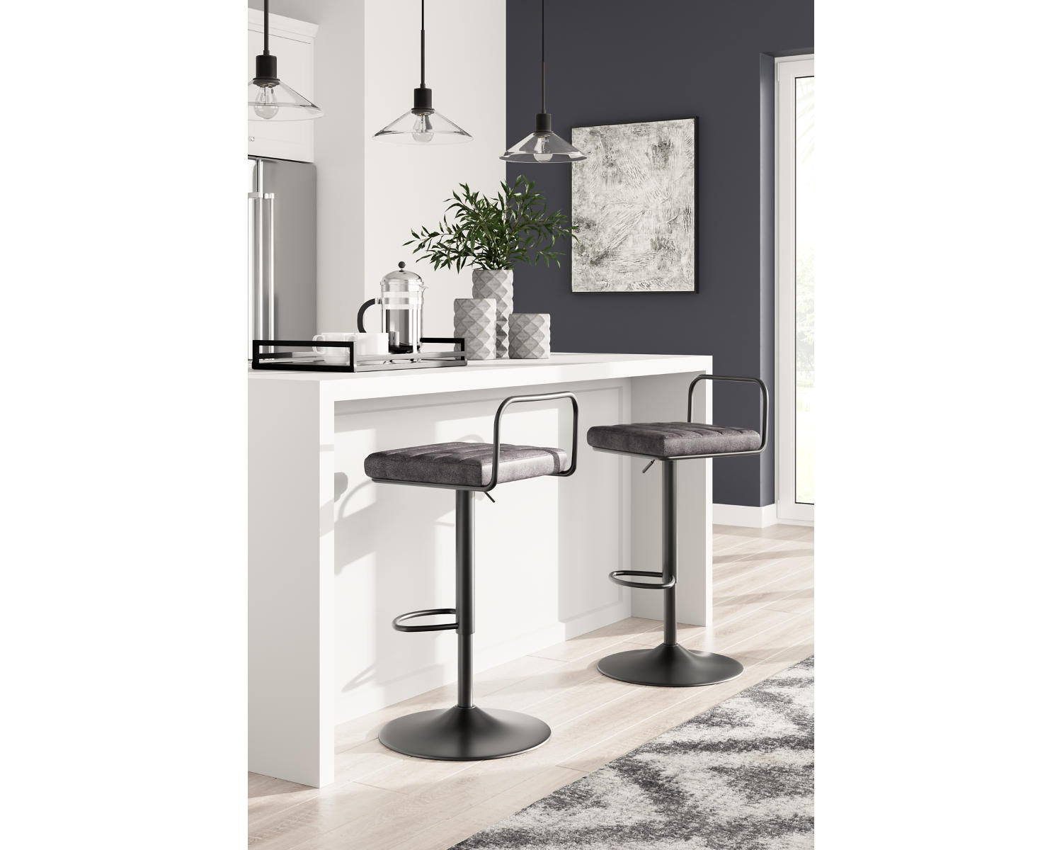 Meet the Strumford Bar Height Bar Stool, a versatile seating solution designed for bar-height counters and entertaining spaces. This set of two stools offers a sleek gray/black palette that fits a range of décor styles. Perfect for kitchens, home bars, or counter-height dining areas.