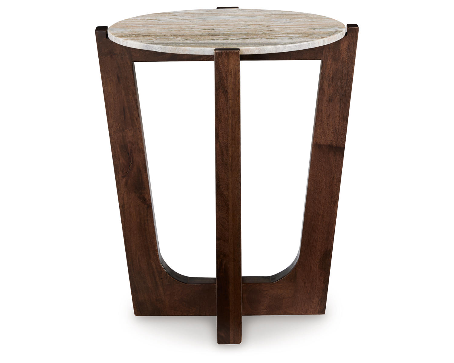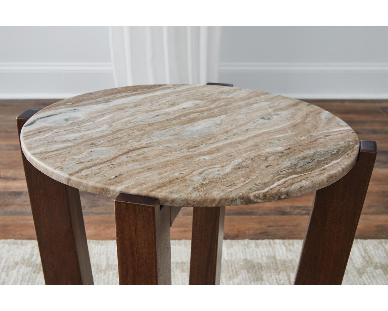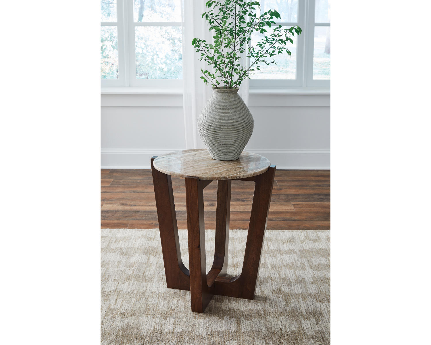 A round end table that blends timeless style with everyday practicality. Designed for living rooms, bedrooms, or entryways, it adds a warm brown finish and a clean silhouette to any decor. A versatile surface for lamps, books, and decor pieces, it completes a seating area with effortless charm.