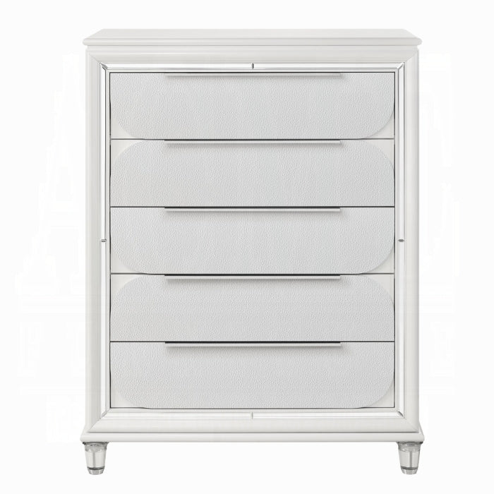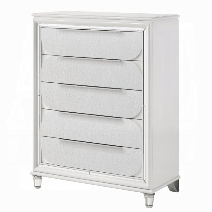 The Tarian Chest blends glamorous style with practical storage for a refined bedroom look. Crafted for long-term use and finished in a fresh pearl white, it adds a touch of glitz without overpowering your space. With five deep drawers, it helps keep clothing and essentials neatly organized.