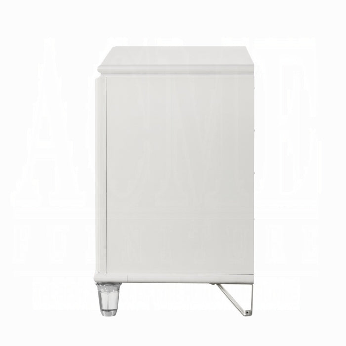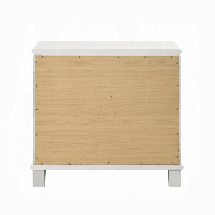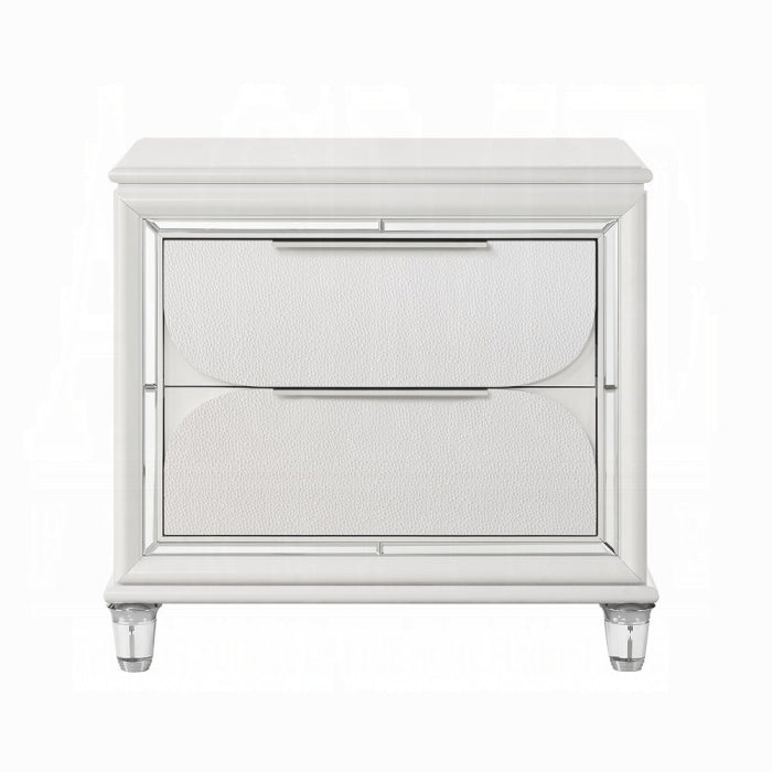 The Tarian nightstand adds stylish glamour to your bedroom with a refined touch of glitz. Finished in a fresh pearl white and accented with mirrored trim, it blends brightness with sophistication. Two deep drawers provide ample bedside storage to keep books, chargers, and personal items organized and within reach.