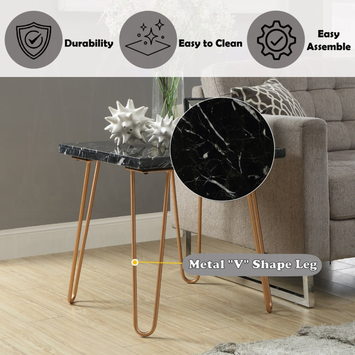 The Telestis End Table adds a touch of modern elegance to any living space. It combines a Black Marble top with a Gold finish to create an eye-catching accent that fits sofa, chair, or bed-side setups. With a compact 22-inch square footprint, it offers practical surface space without crowding your room.
