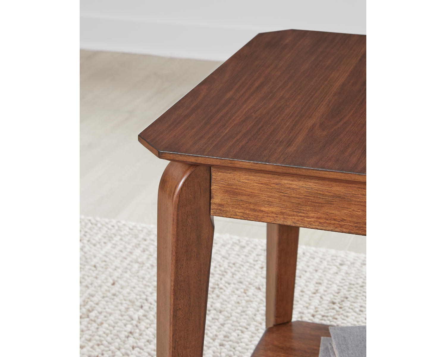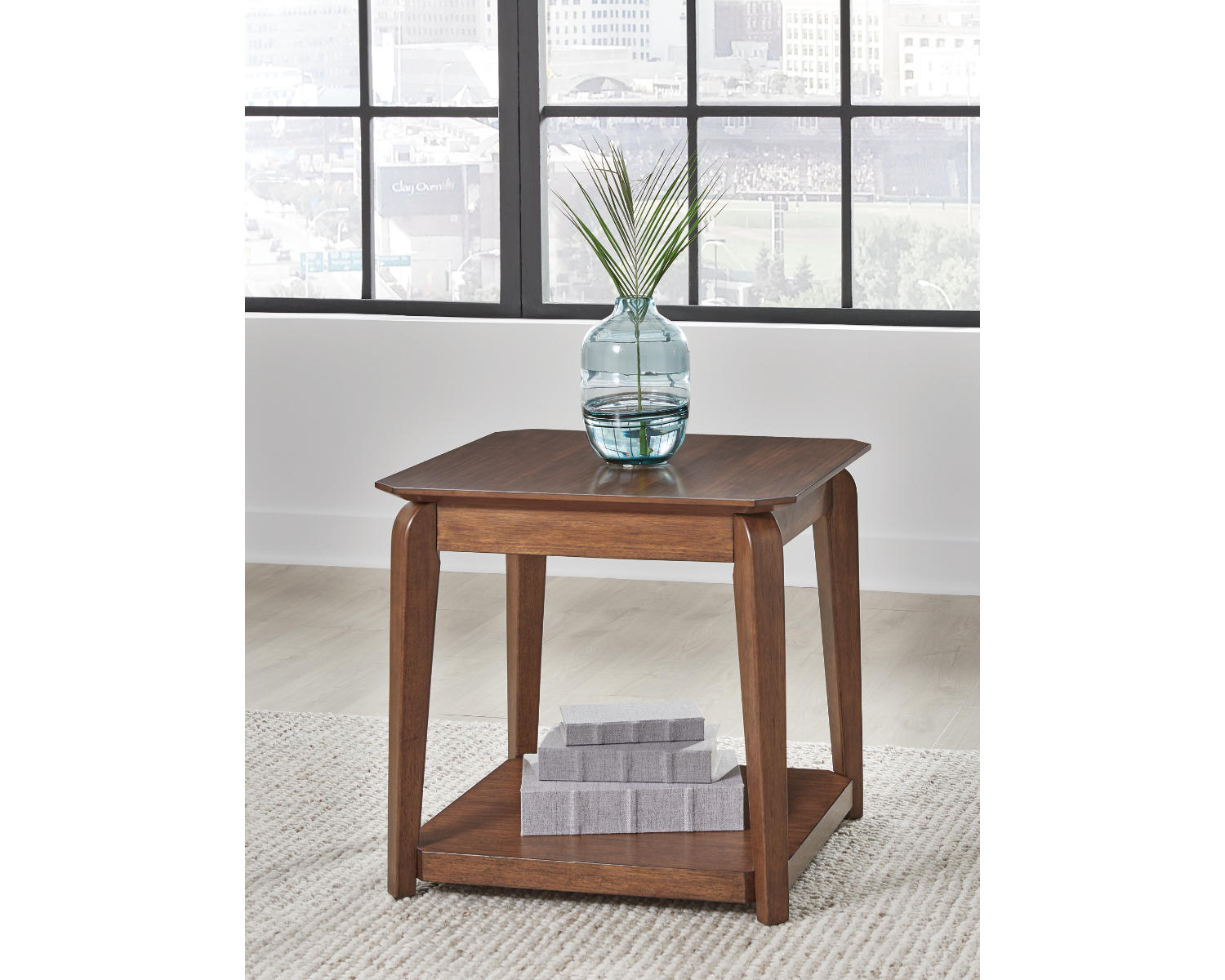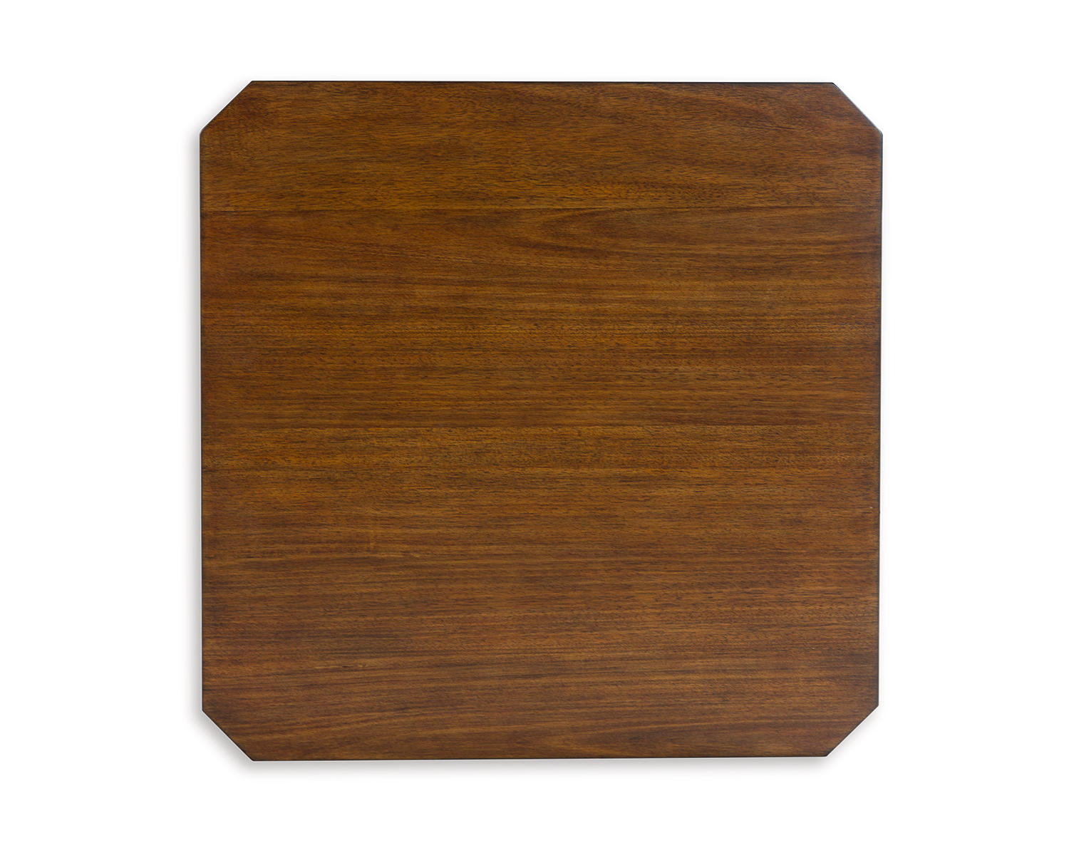 The Trenmour End Table is a square end table designed to fit neatly beside couches, beds, or seating areas. With its medium brown finish, it adds warmth and a timeless touch to any room. This versatile table blends clean lines with practical functionality for everyday use.