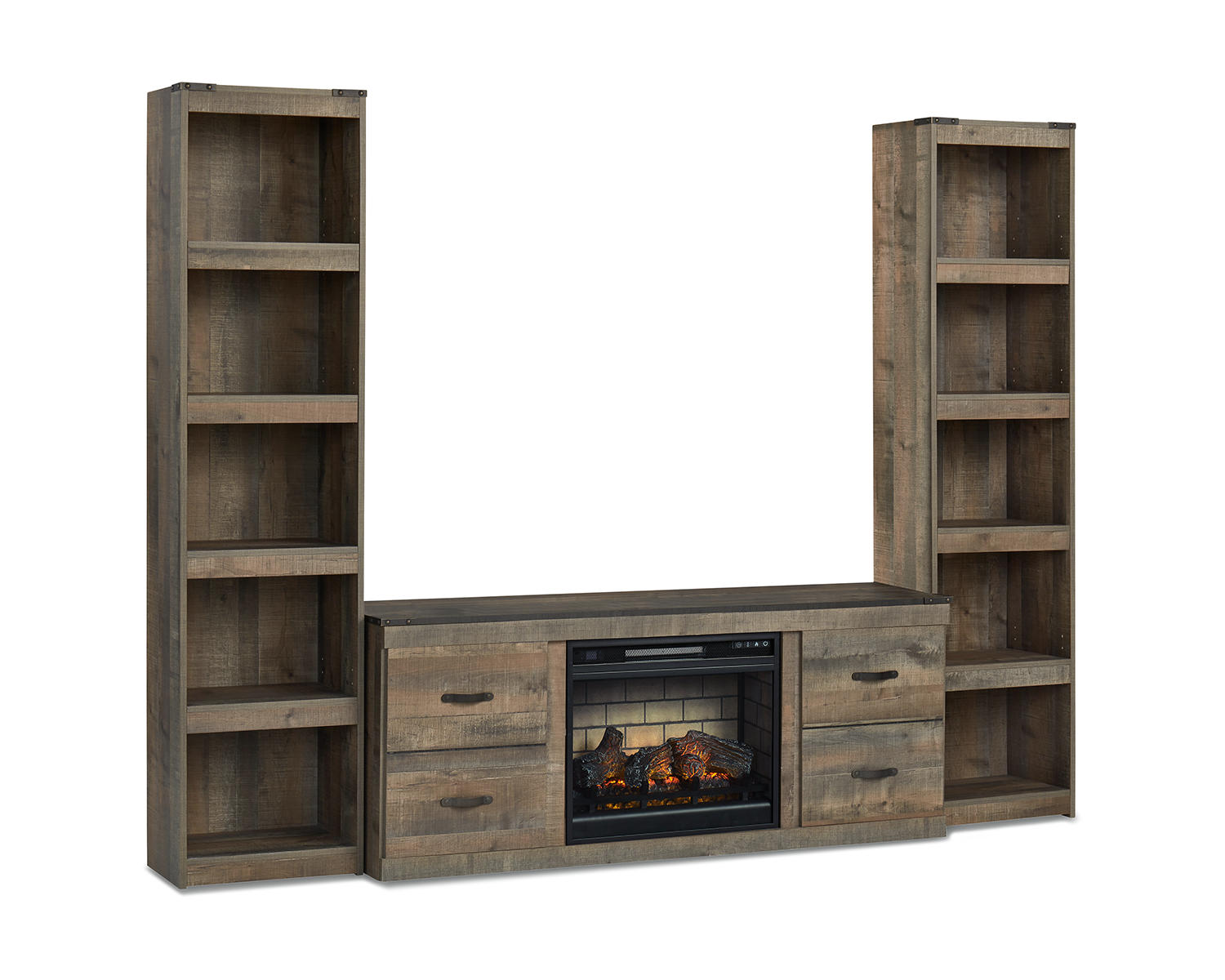 Elevate your living space with the Trinell 3-Piece Entertainment Center featuring a built-in electric fireplace. This brown setup combines warm ambiance with practical media storage, making it ideal for living rooms and home theaters alike.