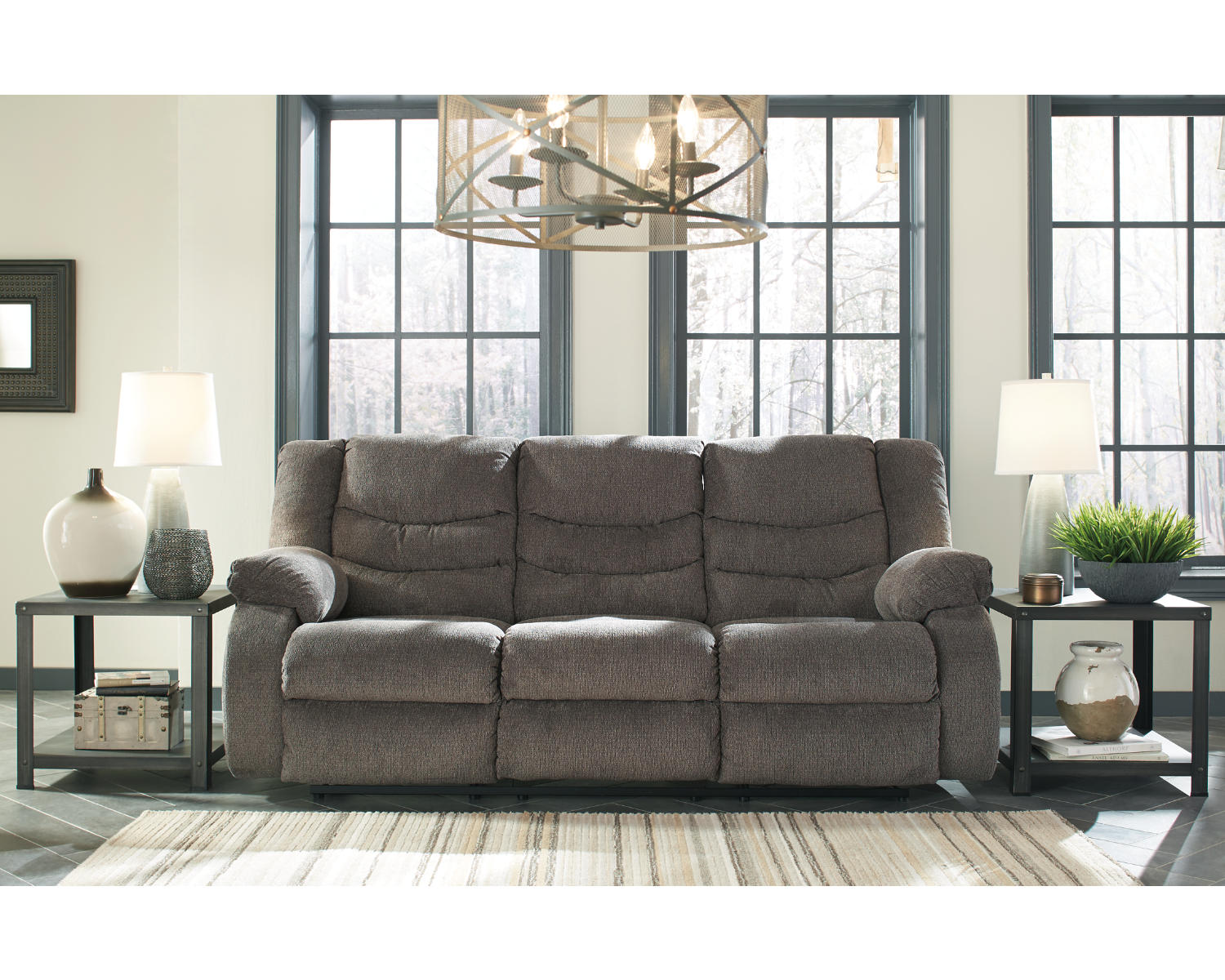 Meet the Tulen Reclining Sofa in gray—a versatile seating option for living rooms, family spaces, or home theaters. Designed for everyday comfort, it blends simple style with a smooth recline that enhances relaxation without overwhelming your layout.