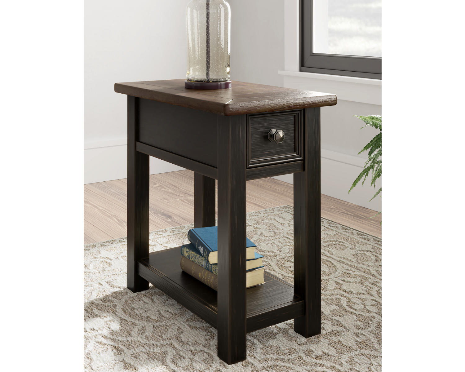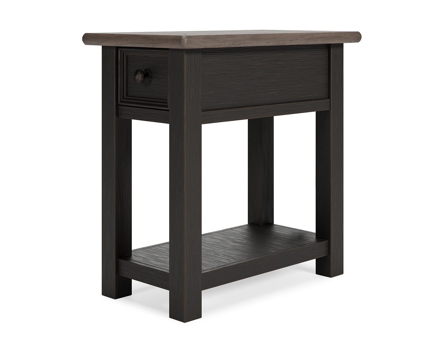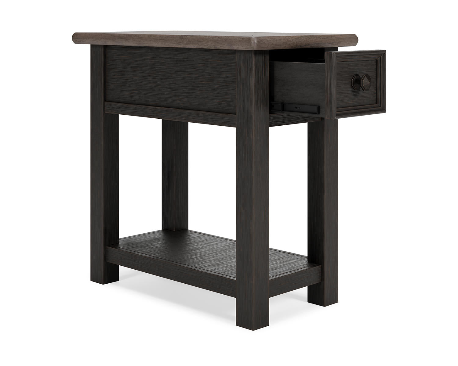 The Tyler Creek Chairside End Table is a compact, practical addition to any living space. With a grayish brown and black finish, it adds contemporary style while keeping essentials within easy reach. Perfect beside a sofa or chair, it provides a simple surface for drinks, remotes, and small decor accents.